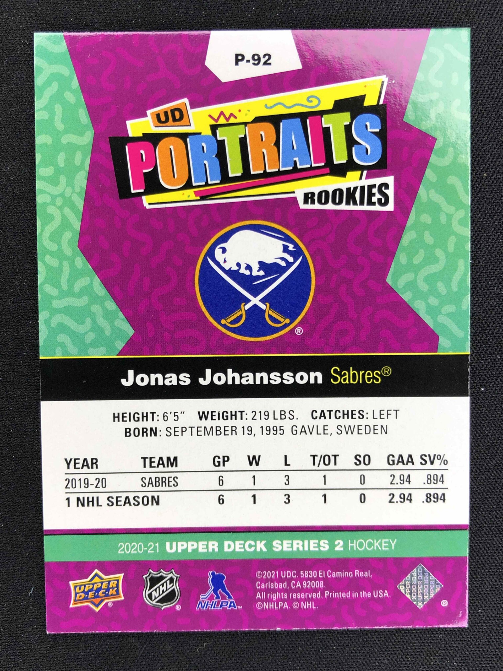 Sběratelská karta 2020/2021 Upper Deck Series 2 Portraits P-92 Jonas Johansson Inzert