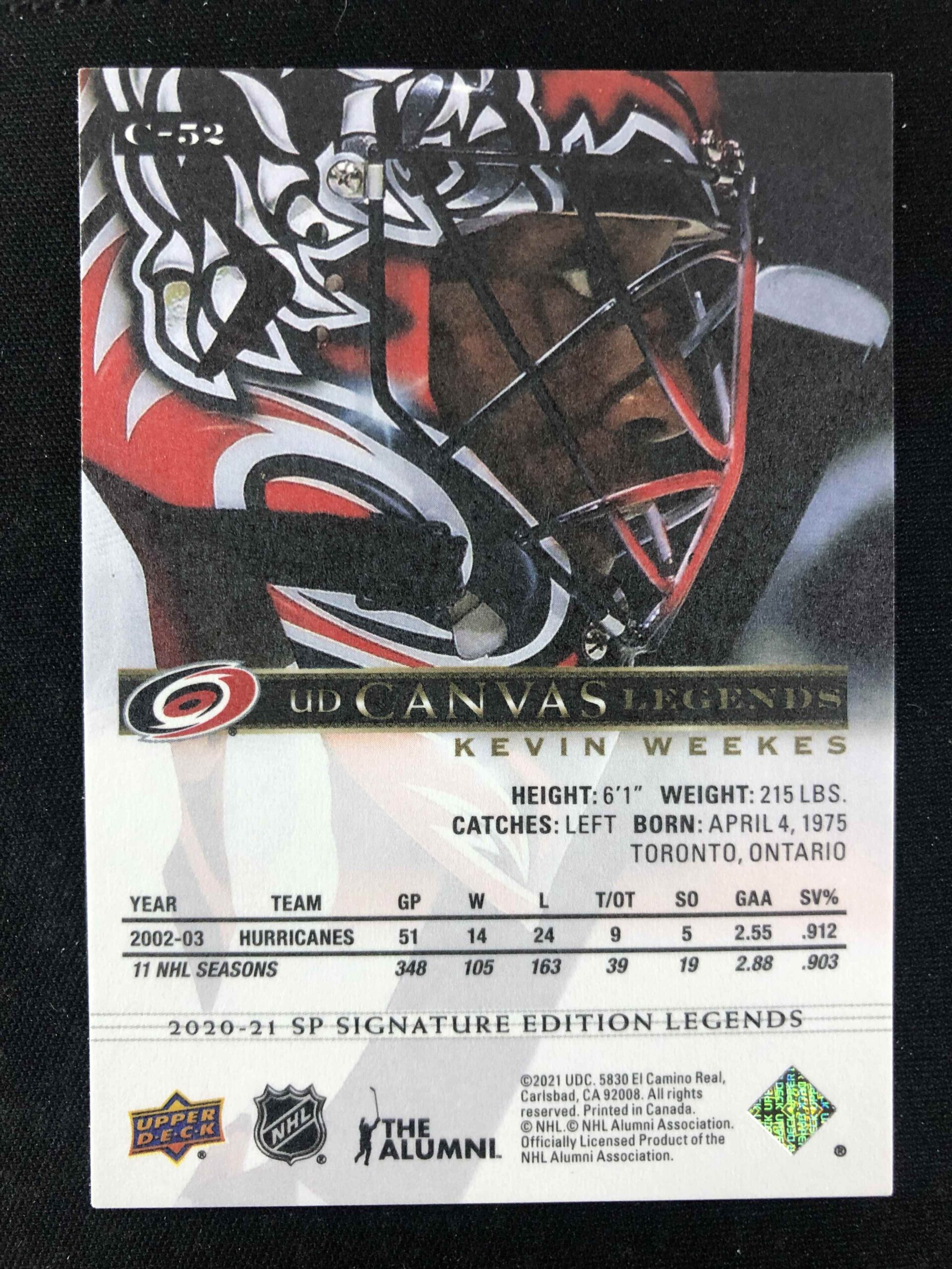 Sběratelská karta 2020/2021 Upper Deck SP Signature Editions Legends Canvas C-52 Kevin Weekes Inzert