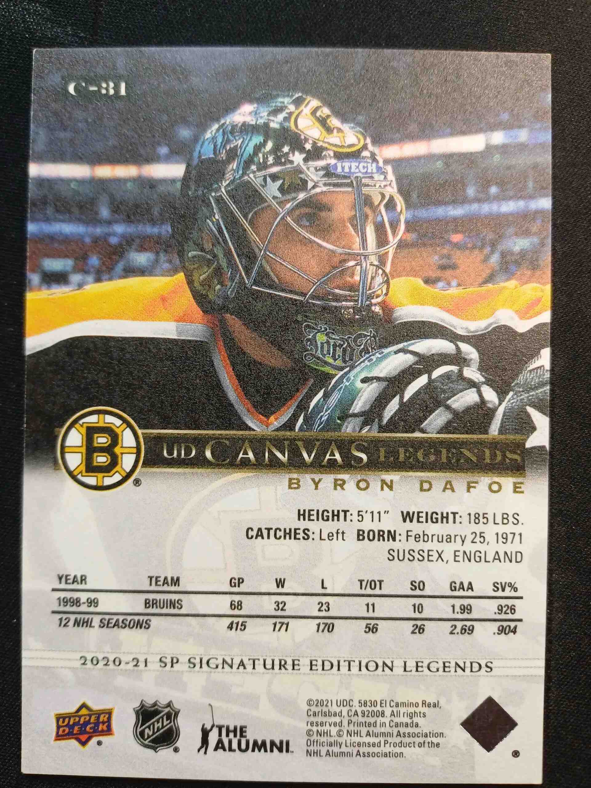 Sběratelská karta 2020/2021 Upper Deck SP Signature Editions Legends Canvas Legends C-31 Byron Dafoe Inzert