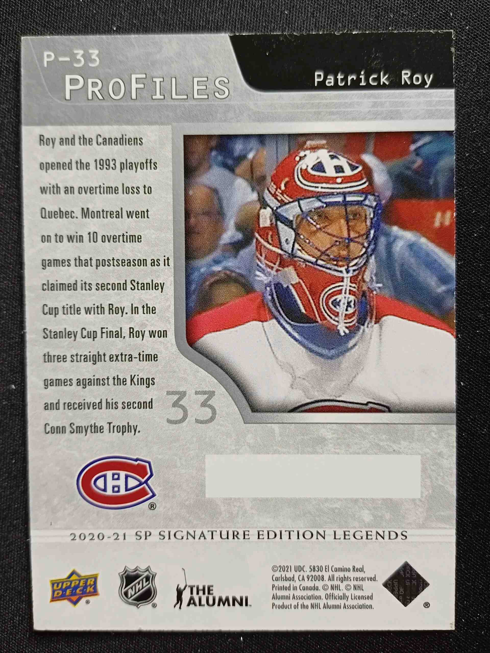 Sběratelská karta 2020/2021 Upper Deck SP Signature Editions Legends ProFiles P-33 Patrick Roy Inzert