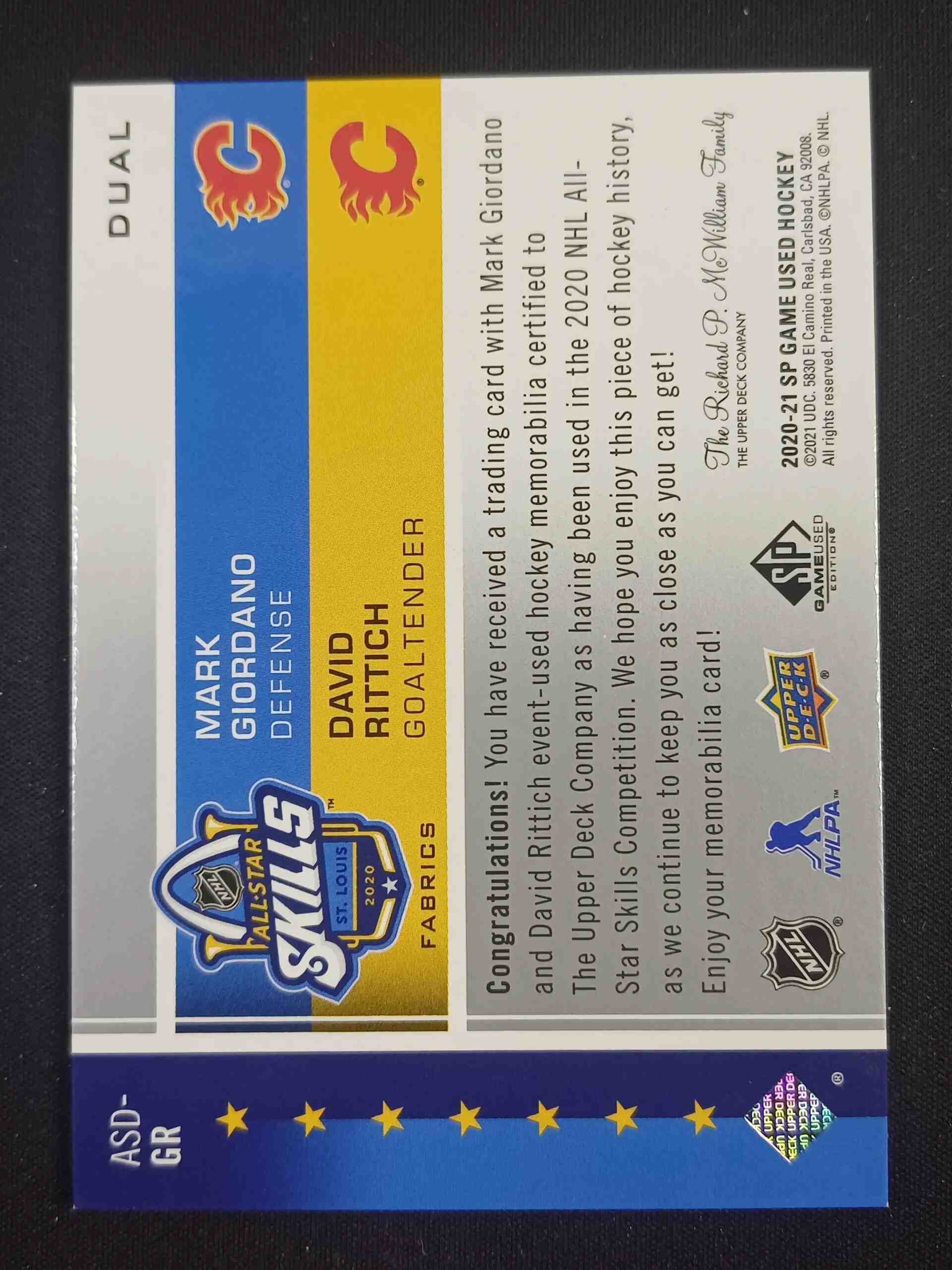 Sběratelská karta 2020/2021 Upper Deck SPGU All-Star Skills Fabrics Dual ASD-GR David Rittich, Mark Giordano Jersey