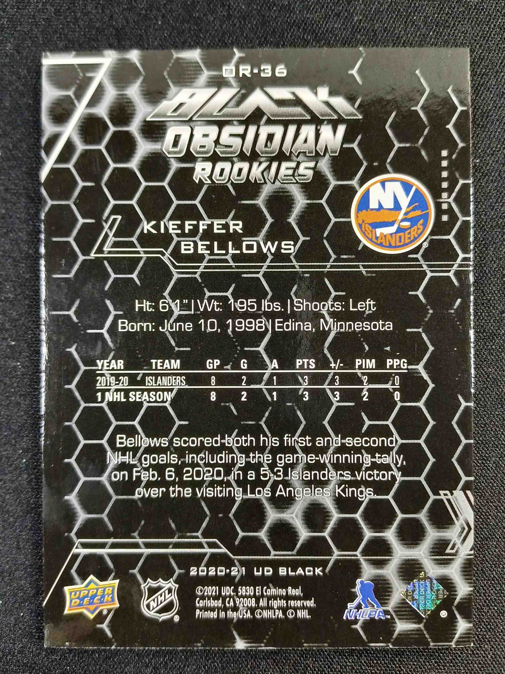 Sběratelská karta 2020/2021 Upper Deck SPx UD Black Obsidian Rookies OR-36 Kieffer Bellows Inzert 006/349