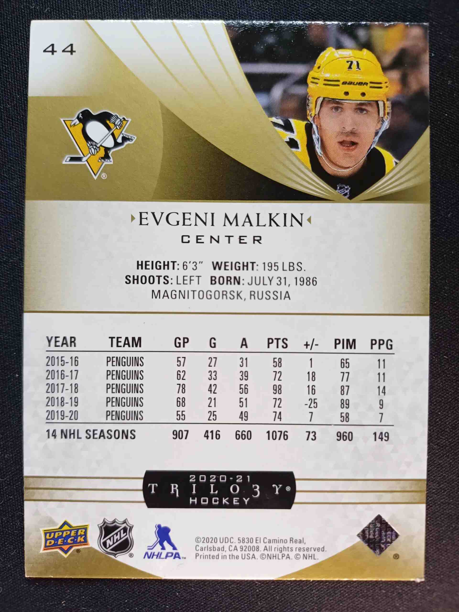 Sběratelská karta 2020/2021 Upper Deck Trilogy Base 44 Evgeni Malkin