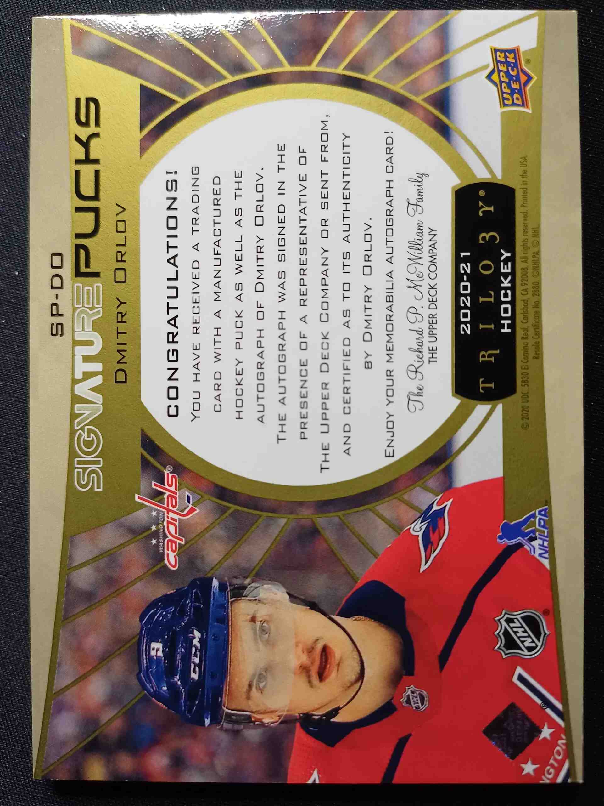 Sběratelská karta 2020/2021 Upper Deck Trilogy Signature Pucks SP-DO Dmitry Orlov AUTO