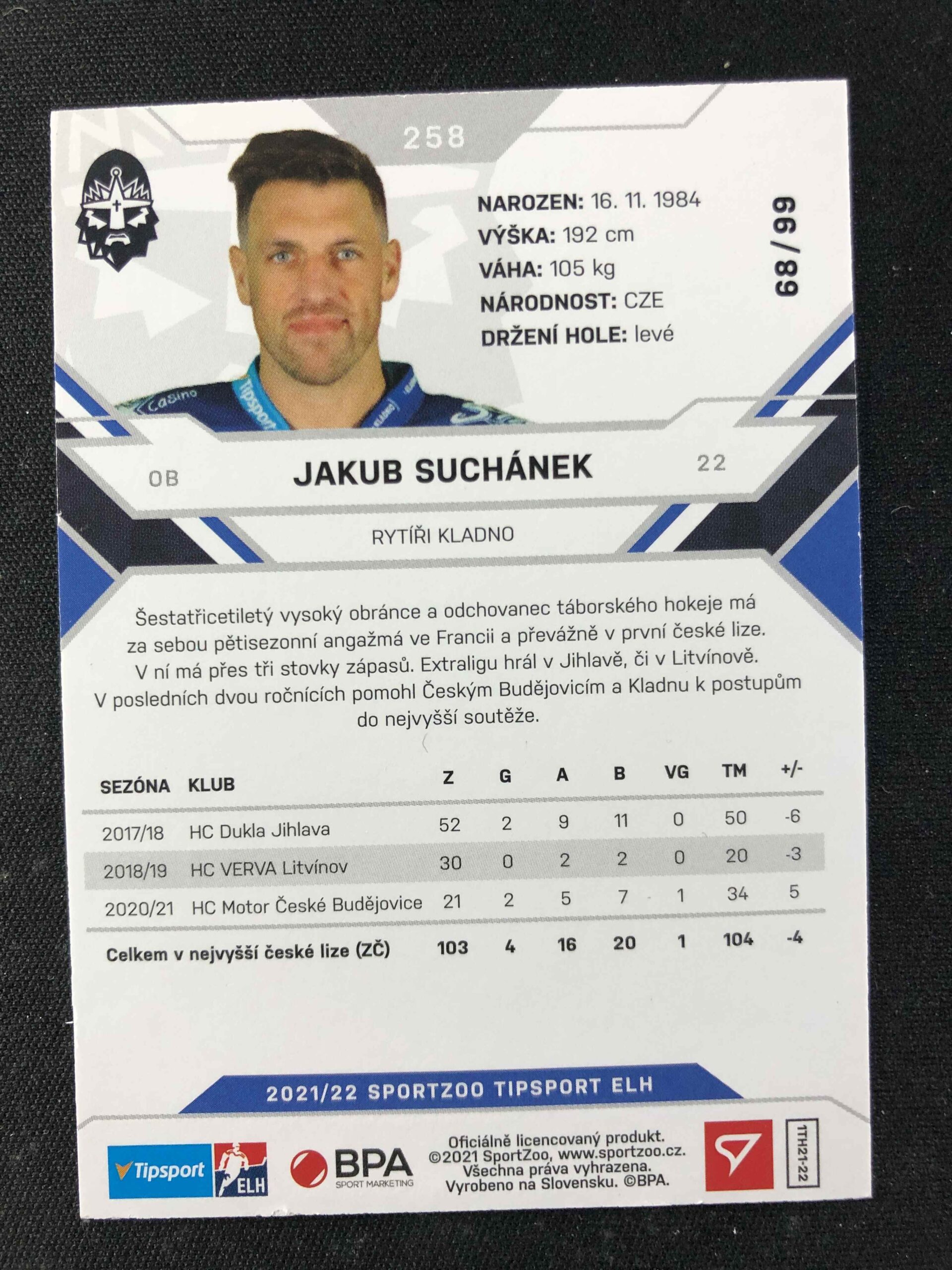 Sběratelská karta 2021/2022 Sportzoo Serie 1 Limited Blue 258 Jakub Suchánek Paralel 68/99