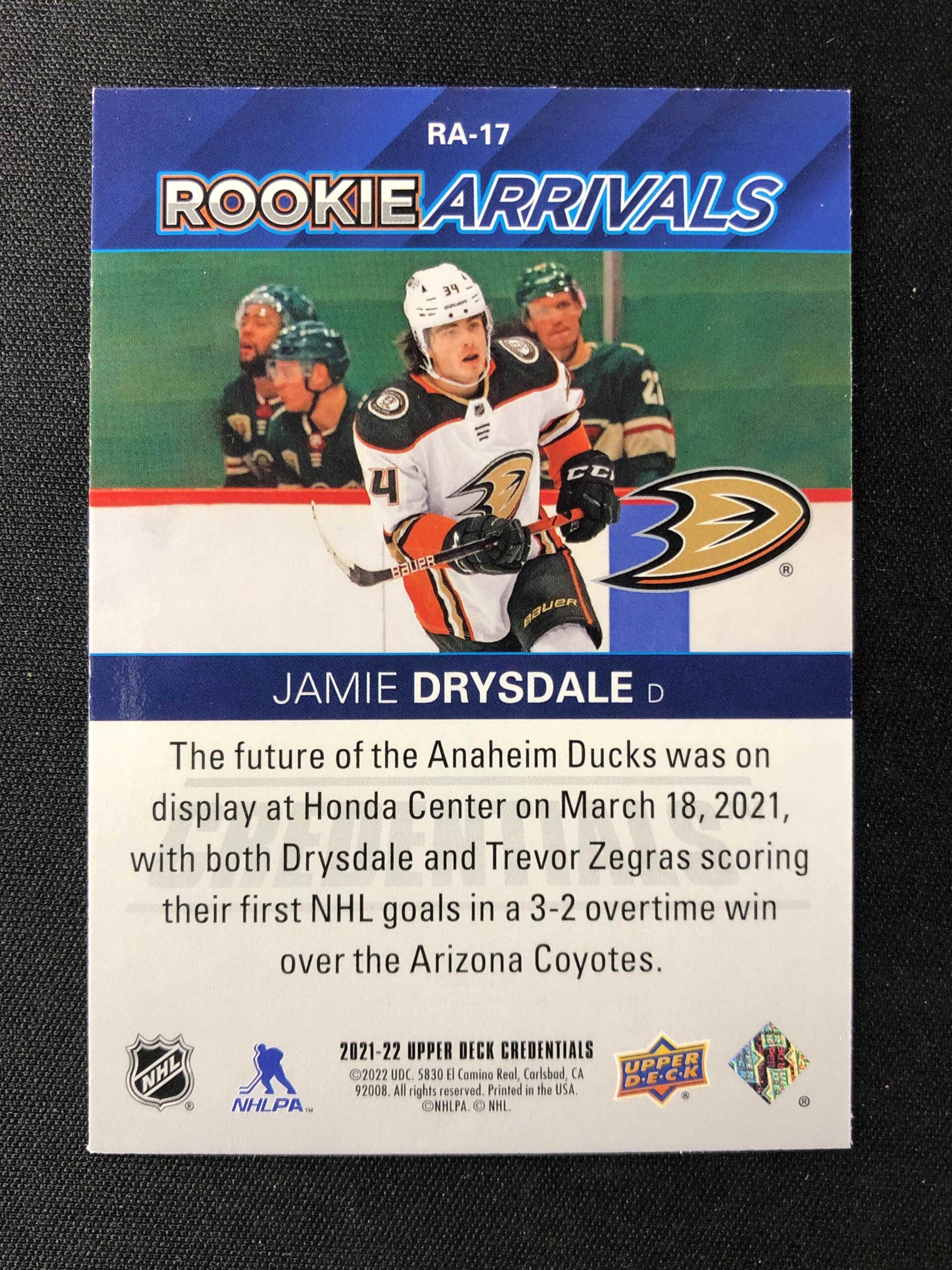 Sběratelská karta 2021/2022 Upper Deck Credentials Rookie Arrivals RA-17 Jamie Drysdale Inzert