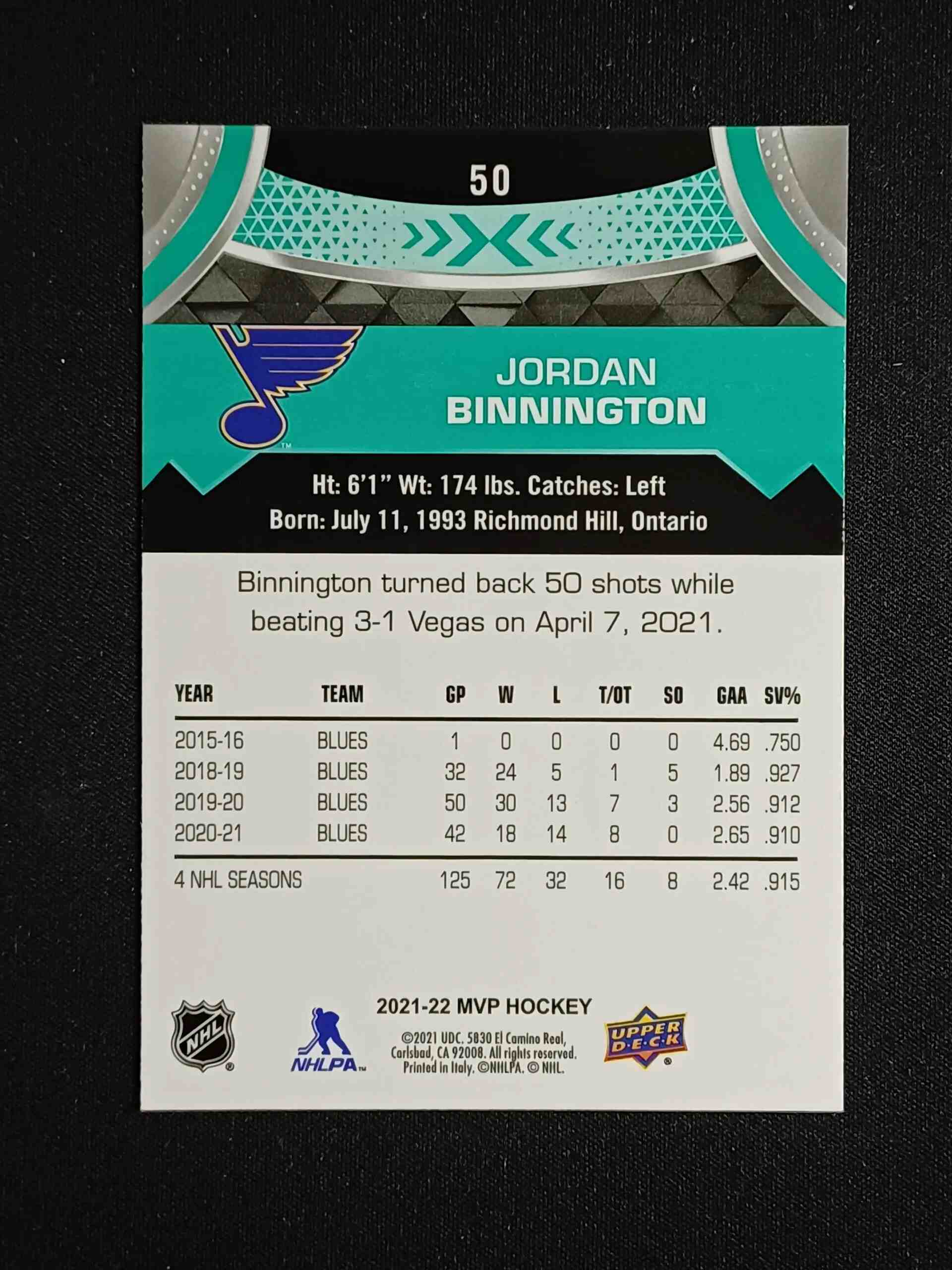 2021/2022 Upper Deck MVP Base 50 Jordan Binnington