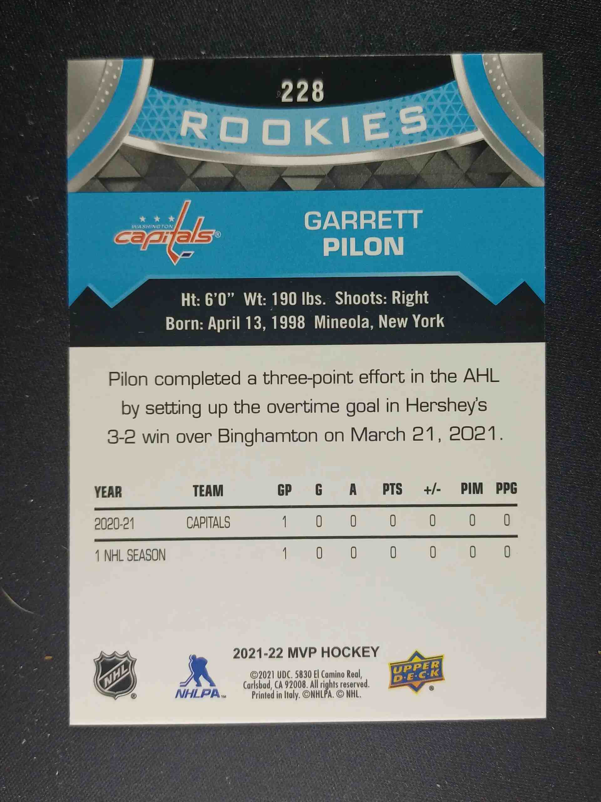 Sběratelská karta 2021/2022 Upper Deck MVP Rookies Factory Set Blue 228 Garrett Pilon Paralel