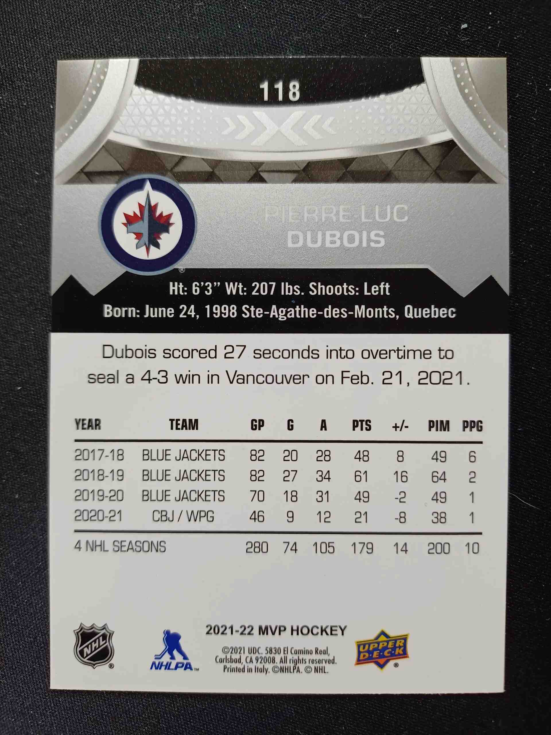 Sběratelská karta 2021/2022 Upper Deck MVP Silver Script 118 Pierre-Luc Dubois Paralel