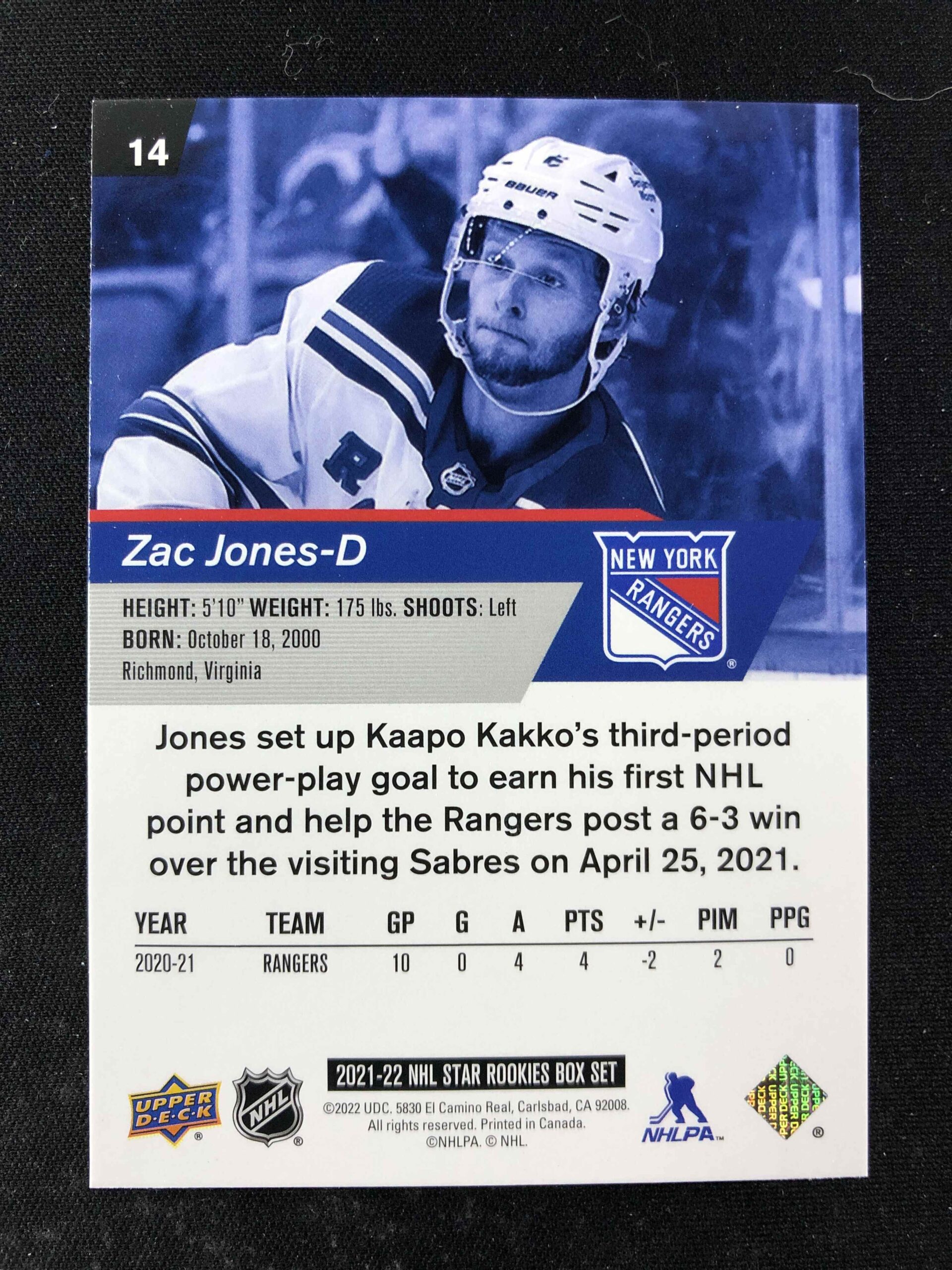 Sběratelská karta 2021/2022 Upper Deck NHL Star Rookies Box Set Base 14 Zac Jones