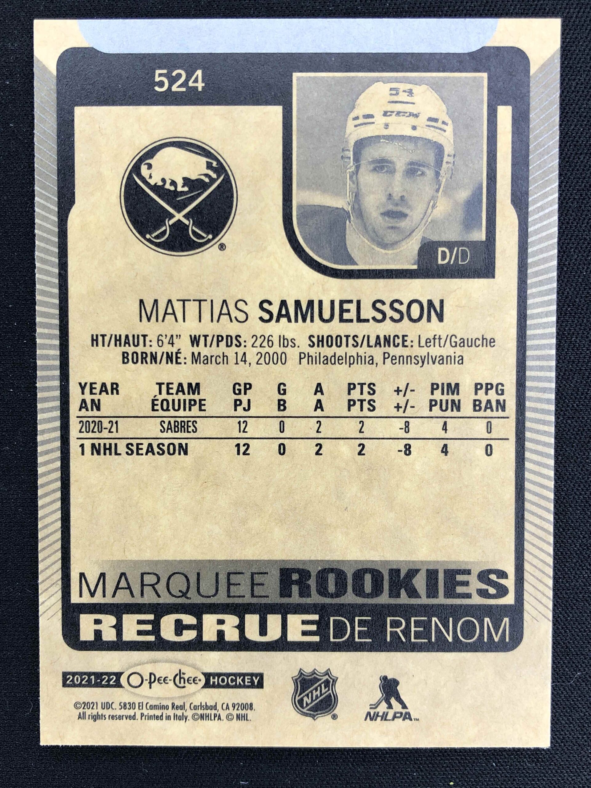 Sběratelská karta 2021/2022 Upper Deck O-Pee-Chee Marquee Rookie 524 Mattias Samuelsson Inzert
