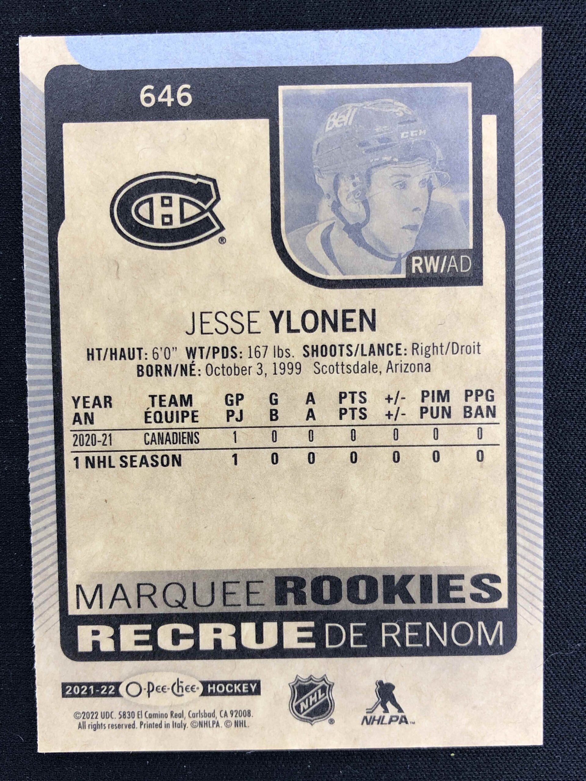 2021/2022 Upper Deck O-Pee-Chee Marquee Rookie 646 Jesse Ylonen Inzert