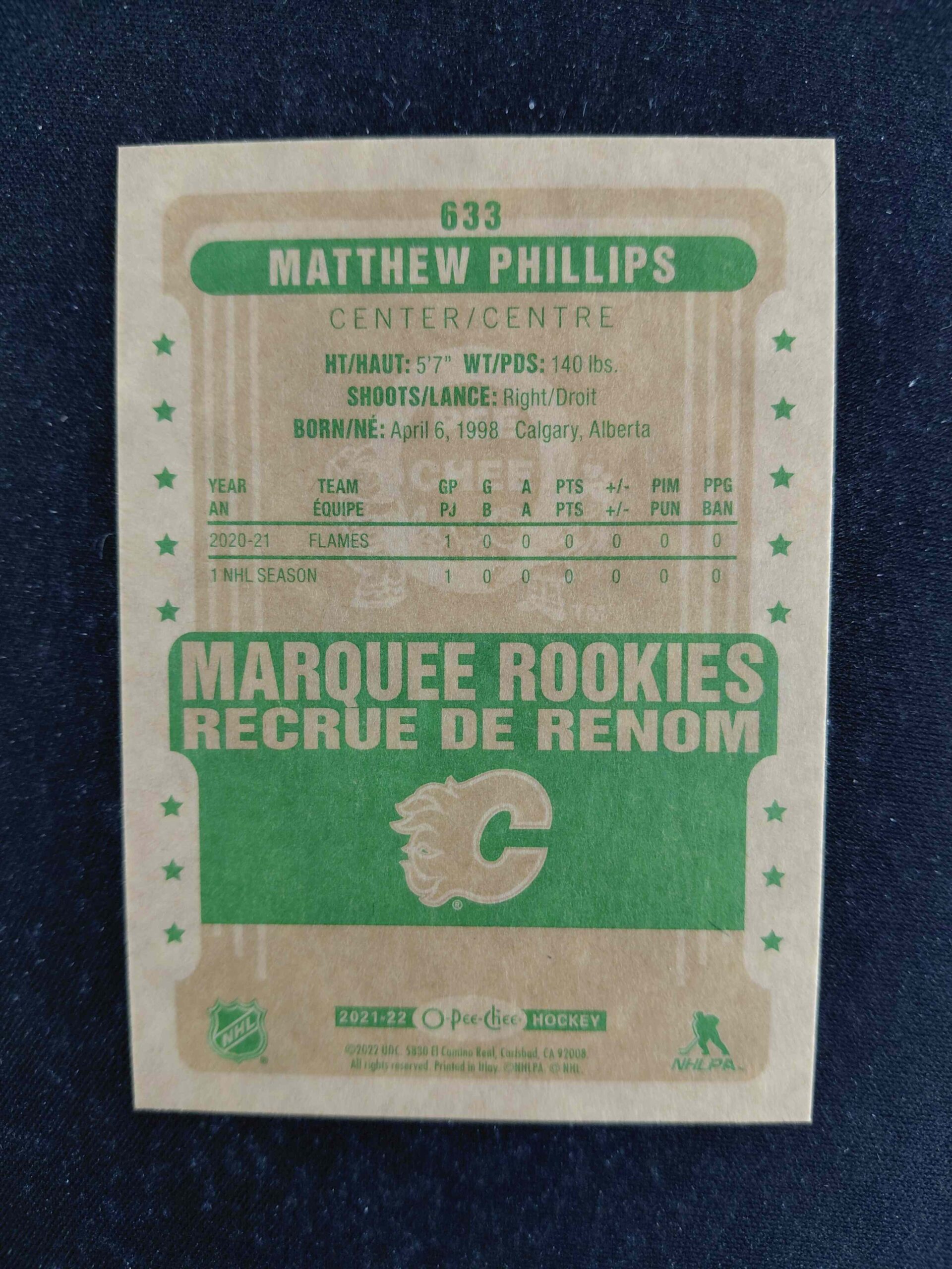 Sběratelská karta 2021/2022 Upper Deck O-Pee-Chee Retro Marquee Rookie 633 Matthew Phillips Paralel