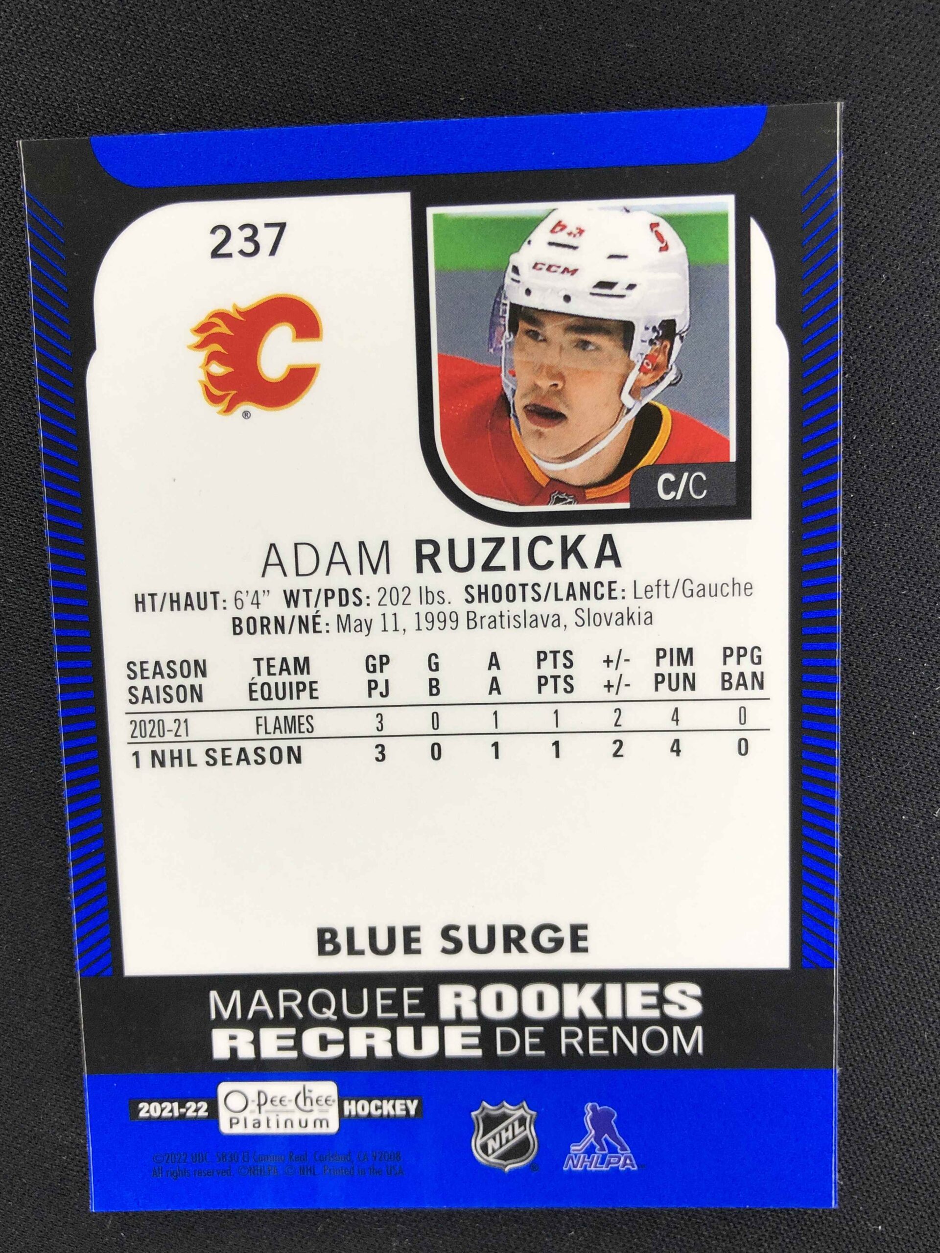 Sběratelská karta 2021/2022 Upper Deck OPC Platinum Blue Surge Marquee Rookies 237 Adam Ruzicka Paralel