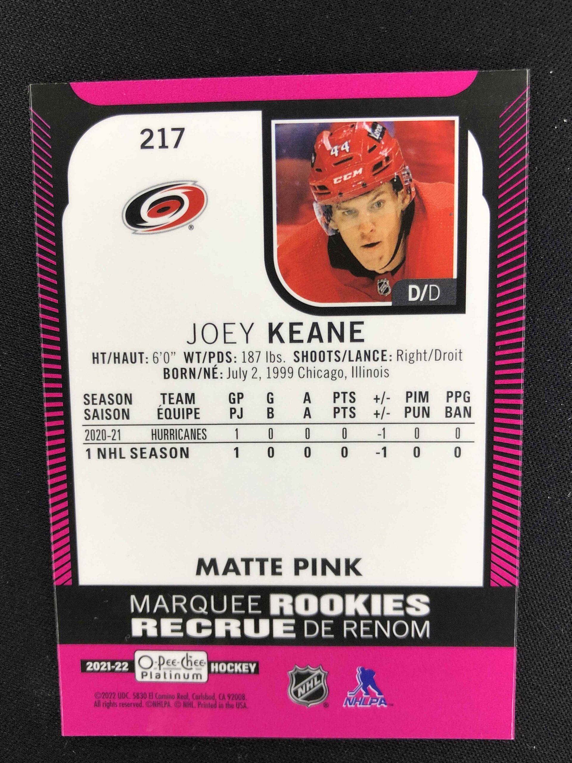 Sběratelská karta 2021/2022 Upper Deck OPC Platinum Matte Pink Marquee Rookie 217 Joey Keane Paralel