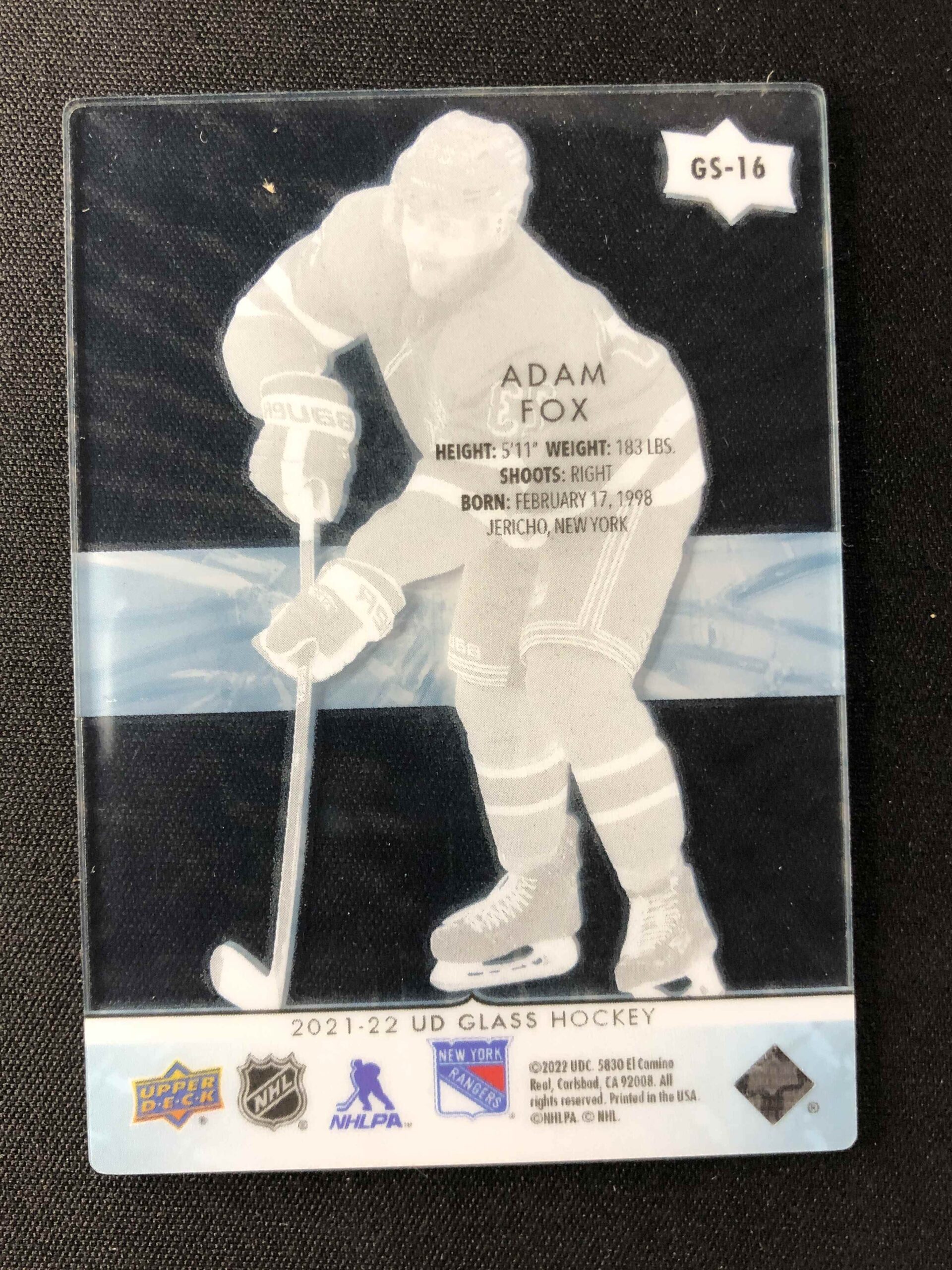 Sběratelská karta 2021/2022 Upper Deck Ovation Glass GS-16 Adam Fox Inzert 214/349