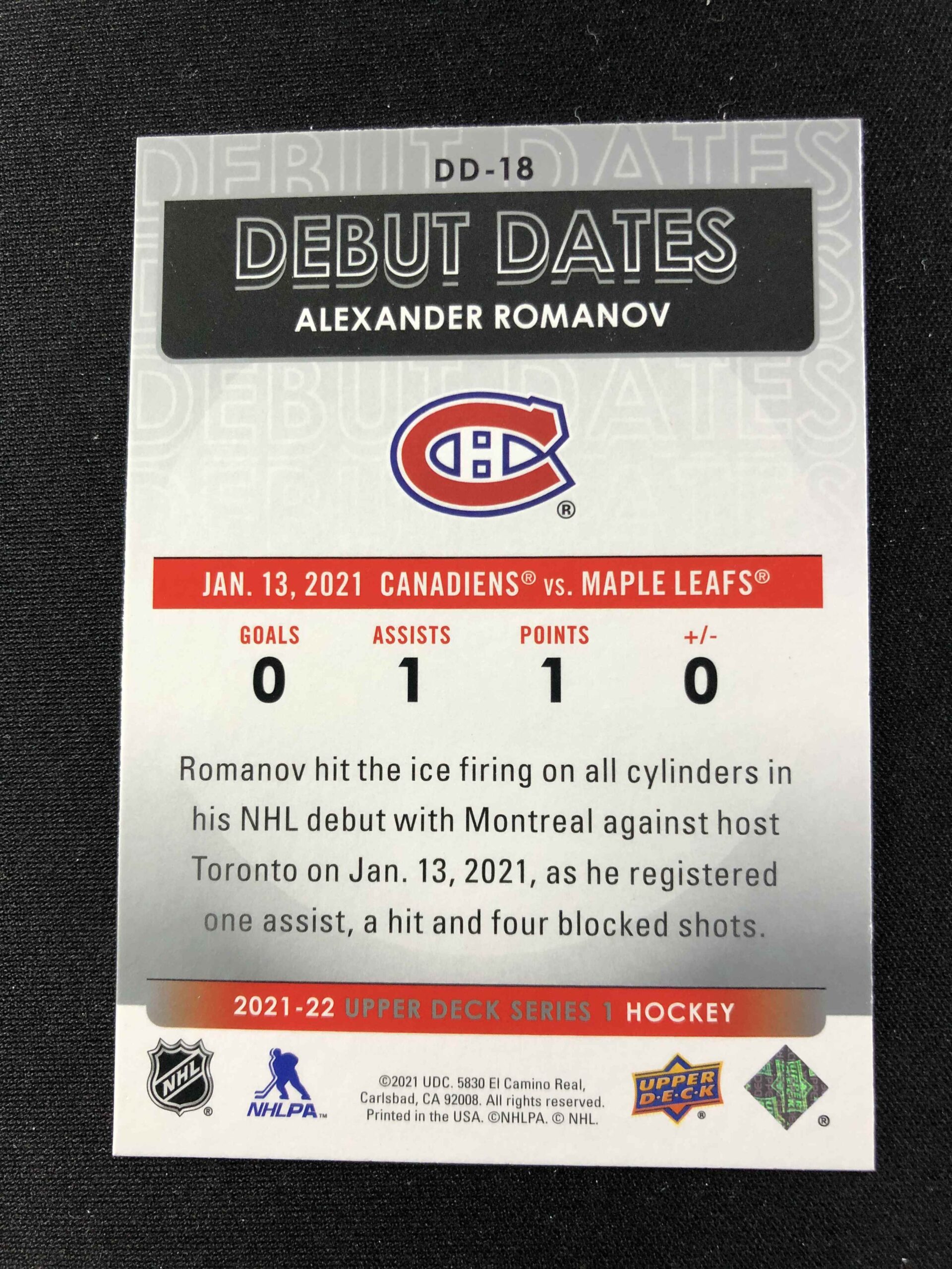Sběratelská karta 2021/2022 Upper Deck Series 1 Debut Dates DD-18 Alexander Romanov Inzert
