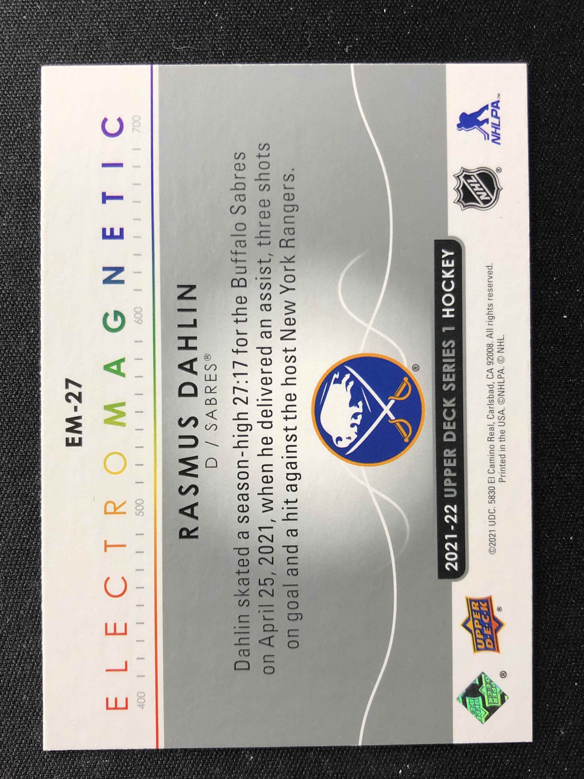 Sběratelská karta 2021/2022 Upper Deck Series 1 Electromagnetic EM-27 Rasmus Dahlin Inzert