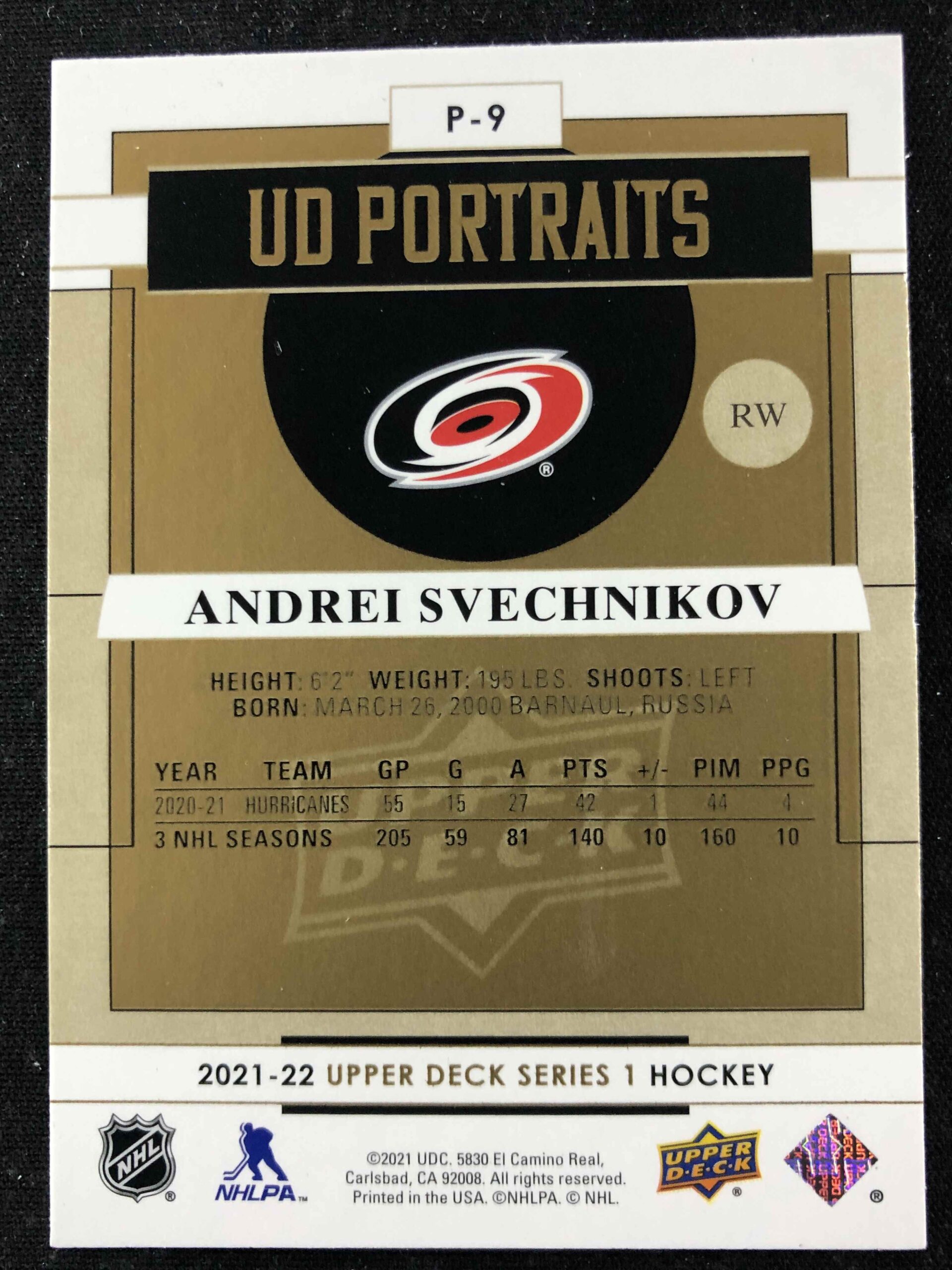 Sběratelská karta 2021/2022 Upper Deck Series 1 Portraits P-9 Andrei Svechnikov Inzert