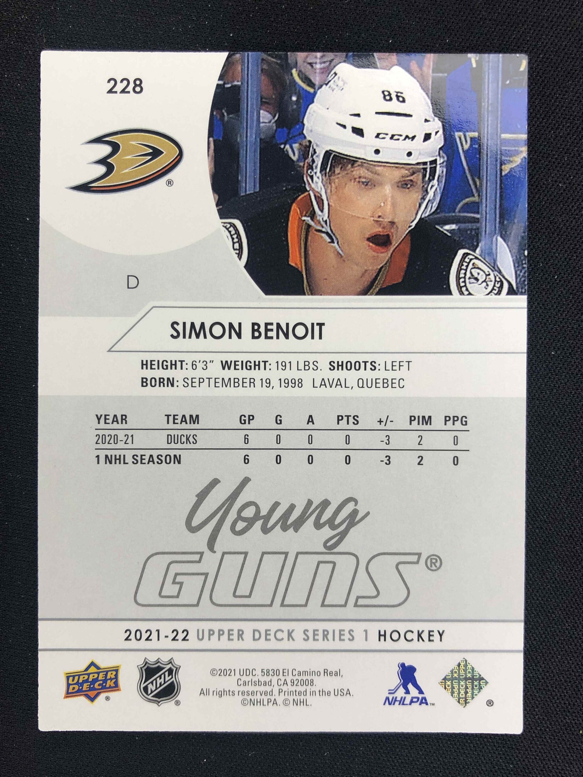 Sběratelská karta 2021/2022 Upper Deck Series 1 Young Guns 228 Simon Benoit Inzert