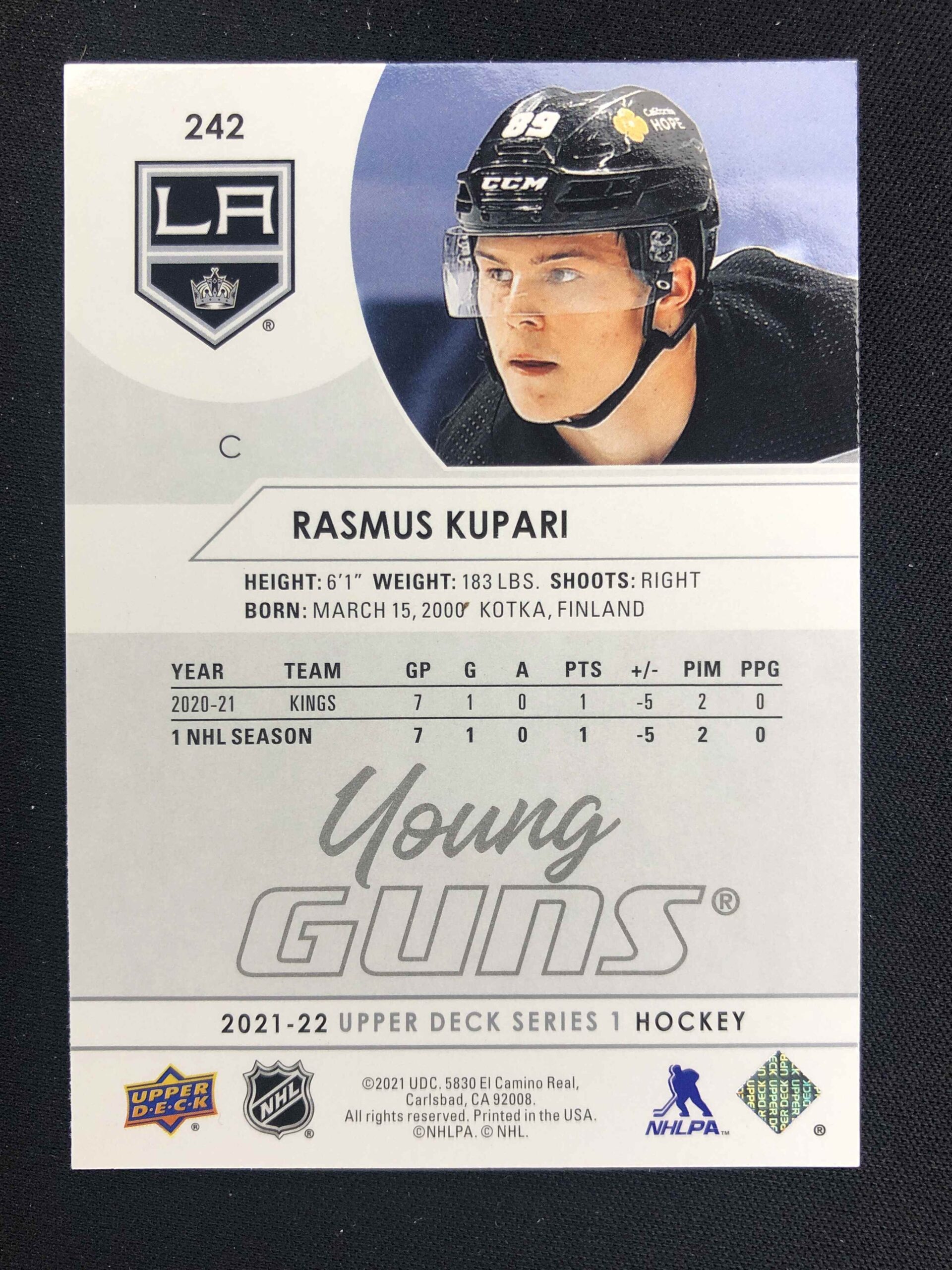 Sběratelská karta 2021/2022 Upper Deck Series 1 Young Guns 242 Rasmus Kupari Inzert