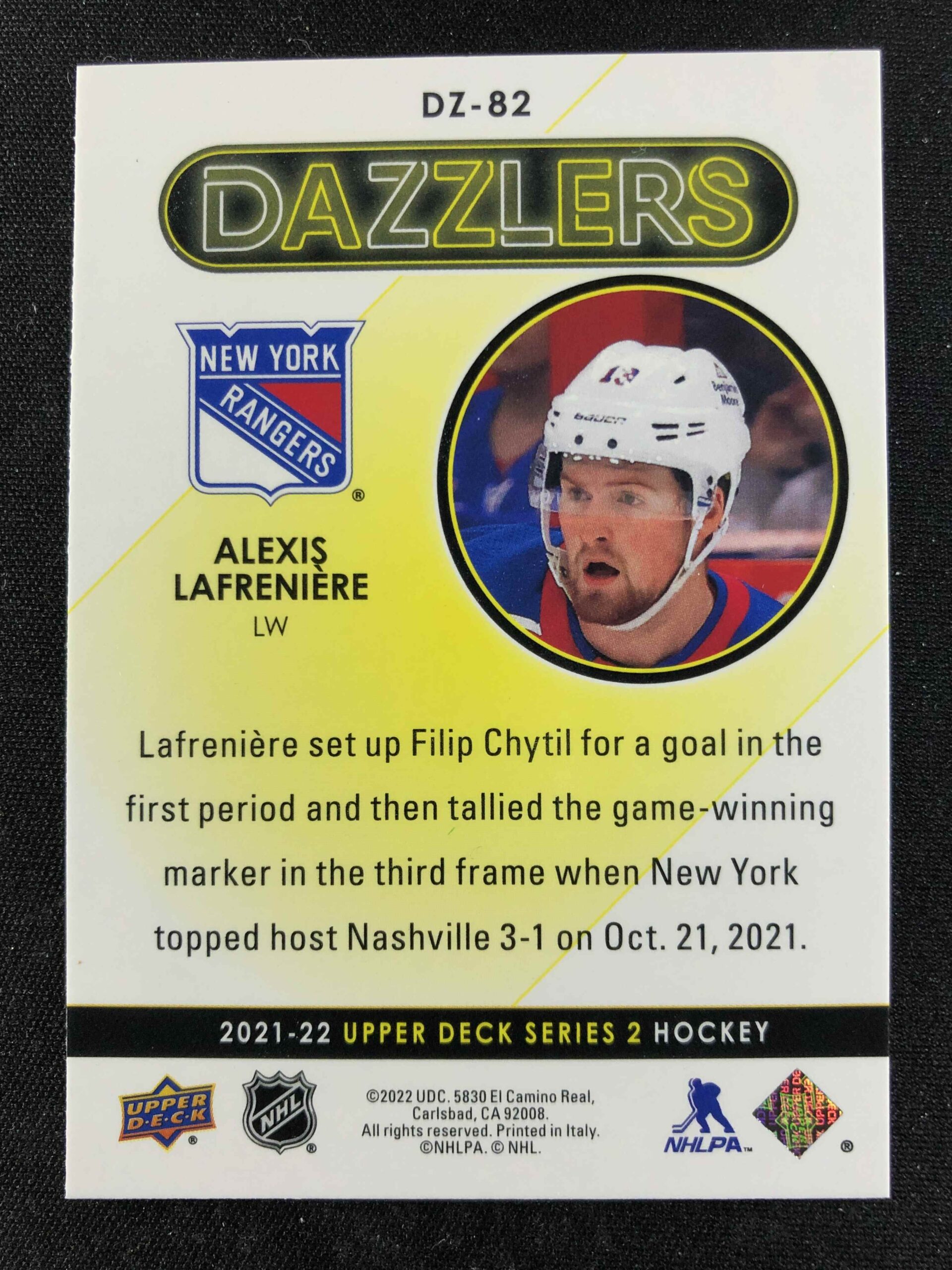 Sběratelská karta 2021/2022 Upper Deck Series 2 Dazzlers Green DZ-82 Alexis Lafreniere Inzert