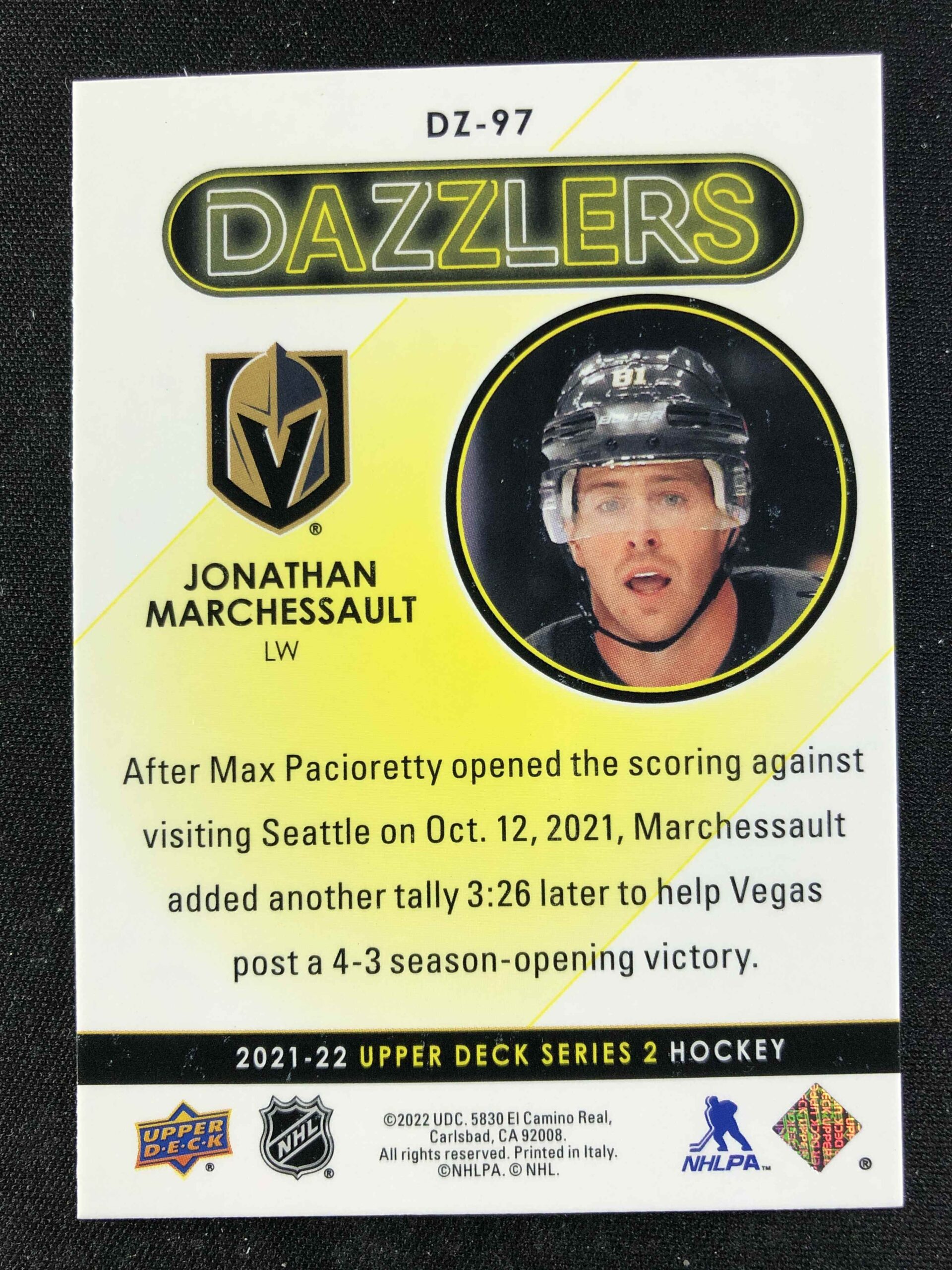 Sběratelská karta 2021/2022 Upper Deck Series 2 Dazzlers Green DZ-97 Jonathan Marchessault Inzert