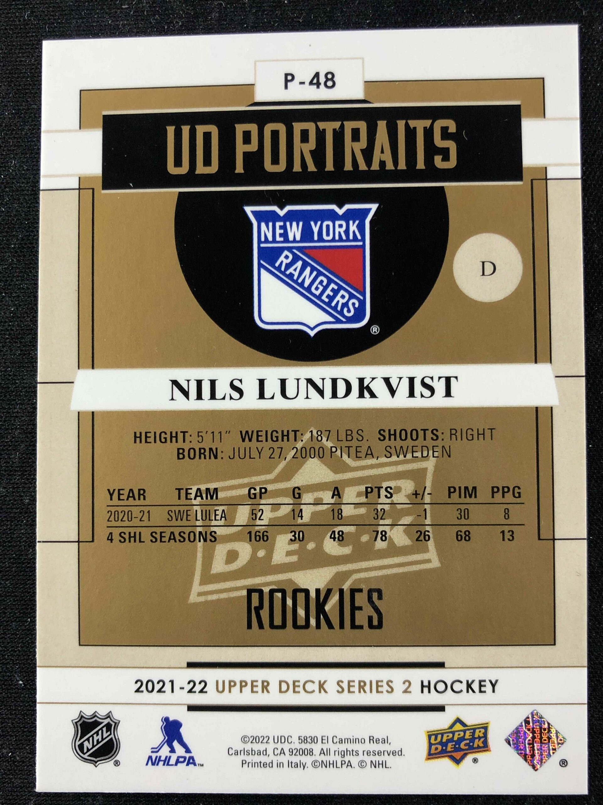 Sběratelská karta 2021/2022 Upper Deck Series 2 Portraits P-48 Nils Lundkvist Inzert
