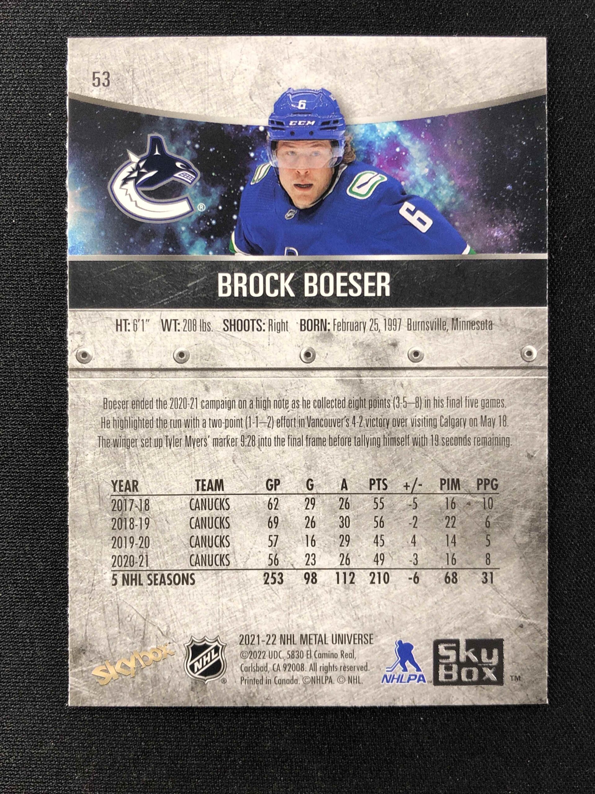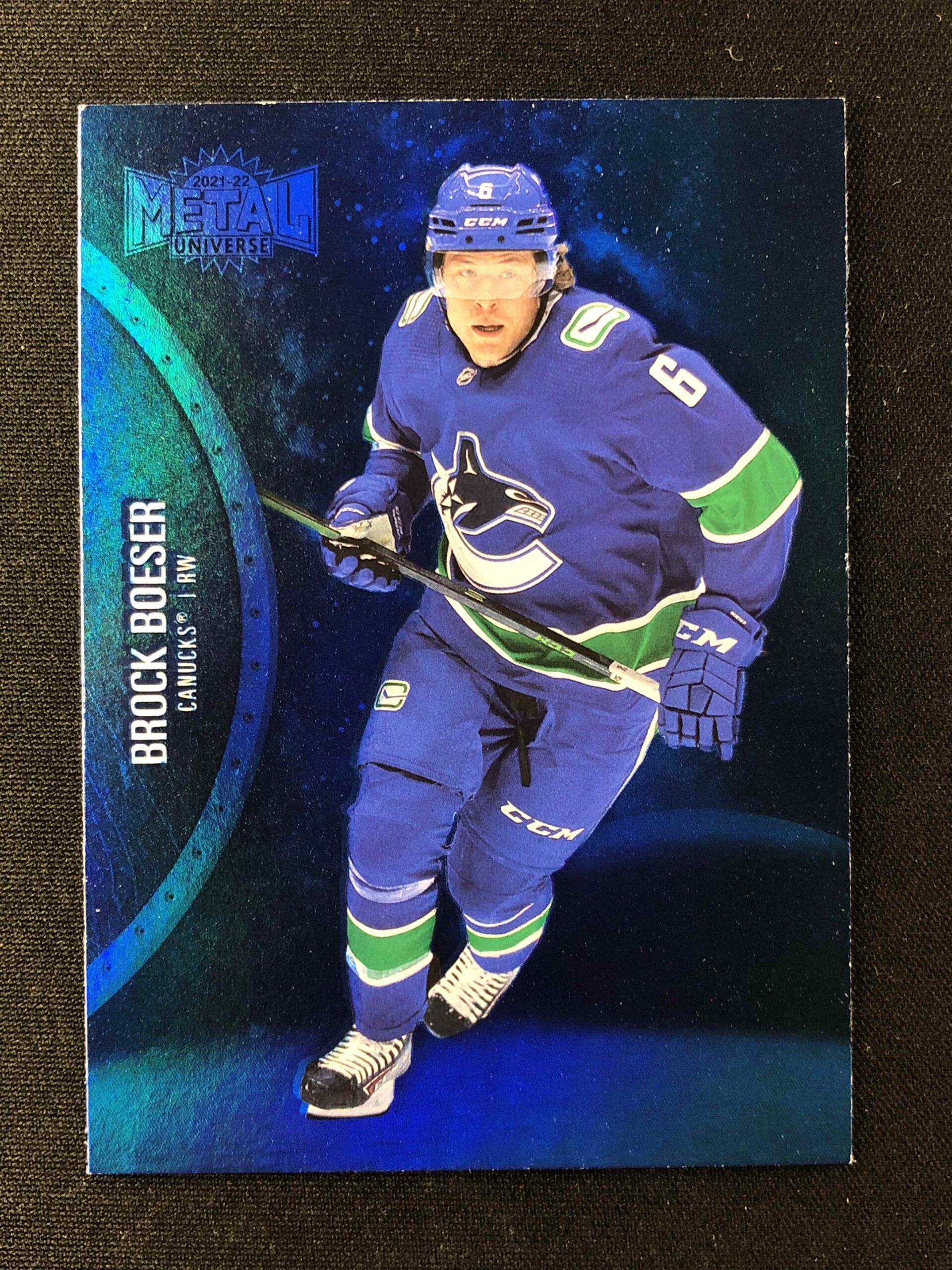 Sběratelská karta 2021/2022 Upper Deck Skybox Metal Universe Blue Spectrum 53 Brock Boeser Paralel