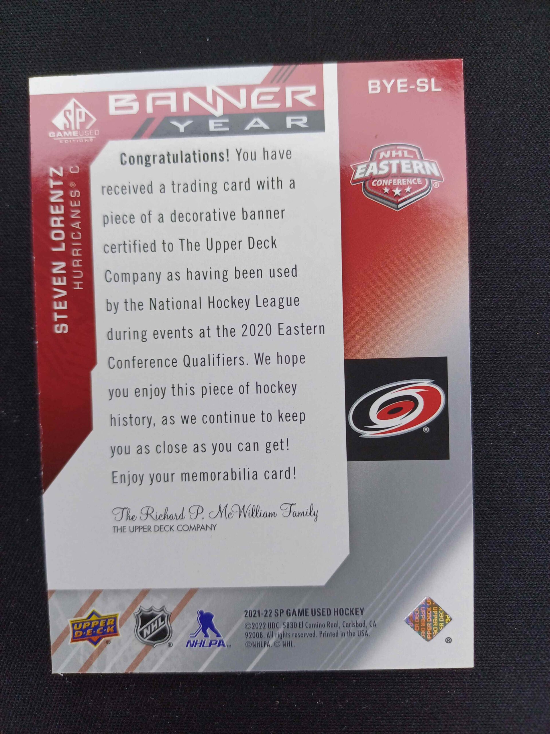Sběratelská karta 2021/2022 Upper Deck SPGU Banner Year BYE-SL Steven Lorentz Jersey