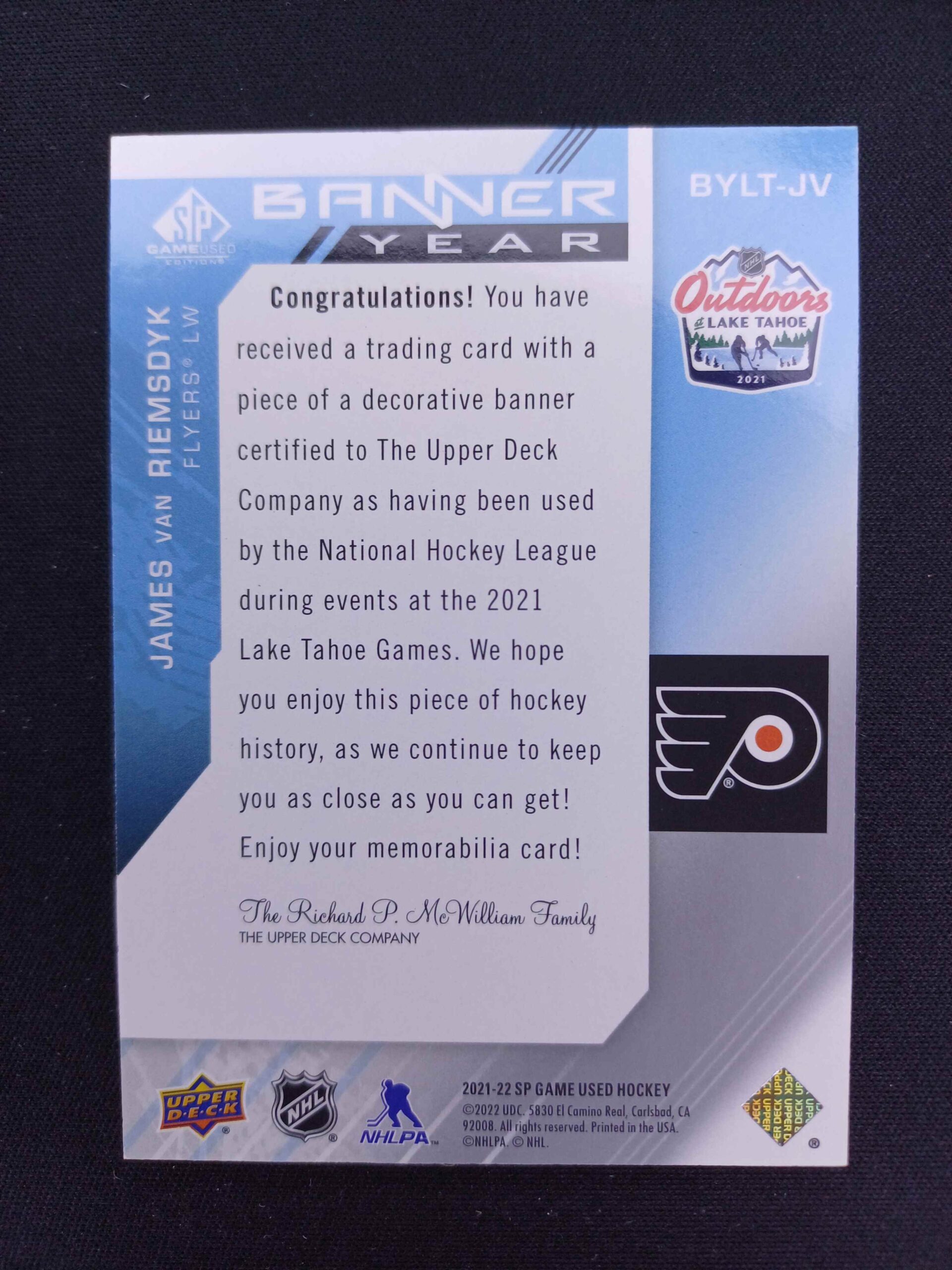 Sběratelská karta 2021/2022 Upper Deck SPGU Banner Year BYLT-JV James van Riemsdyk Jersey