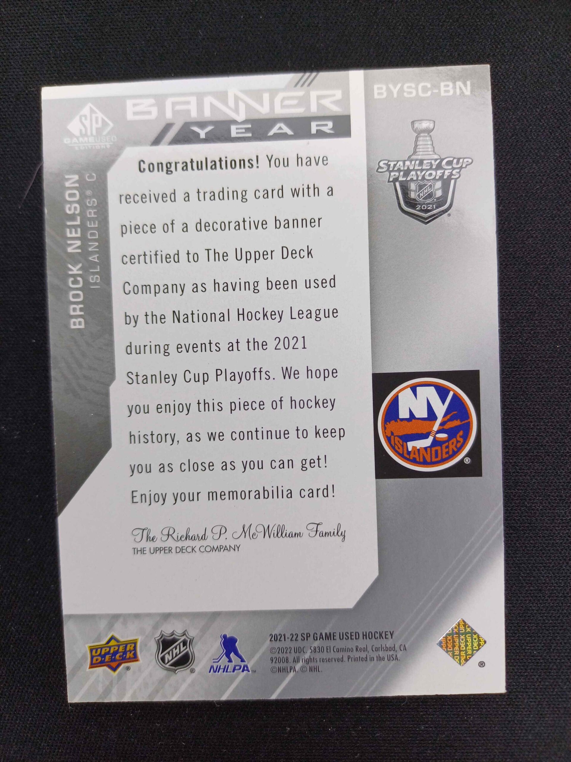 Sběratelská karta 2021/2022 Upper Deck SPGU Banner Year BYSC-BN Brock Nelson Jersey