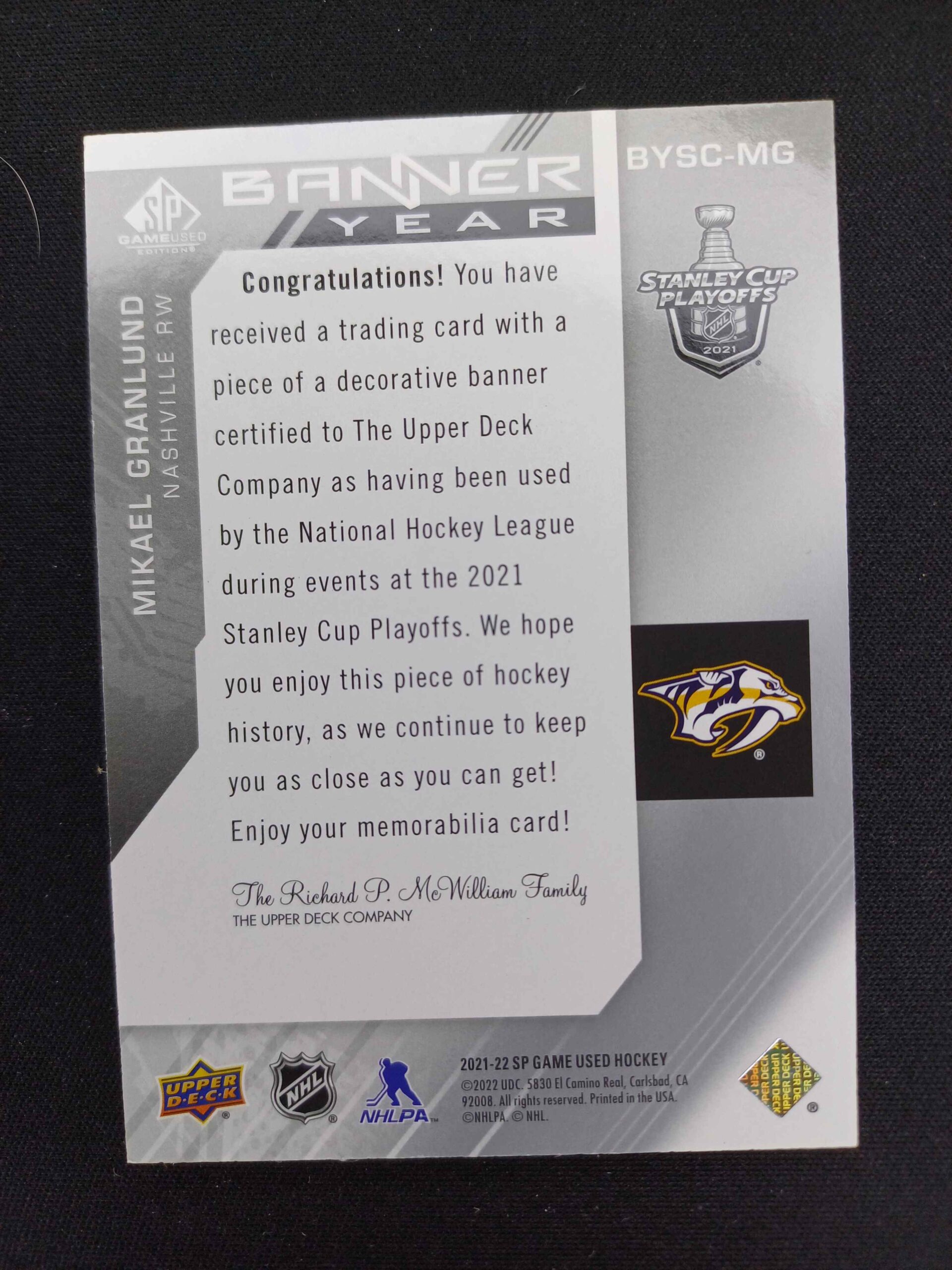 Sběratelská karta 2021/2022 Upper Deck SPGU Banner Year BYSC-MG Mikael Granlund Jersey