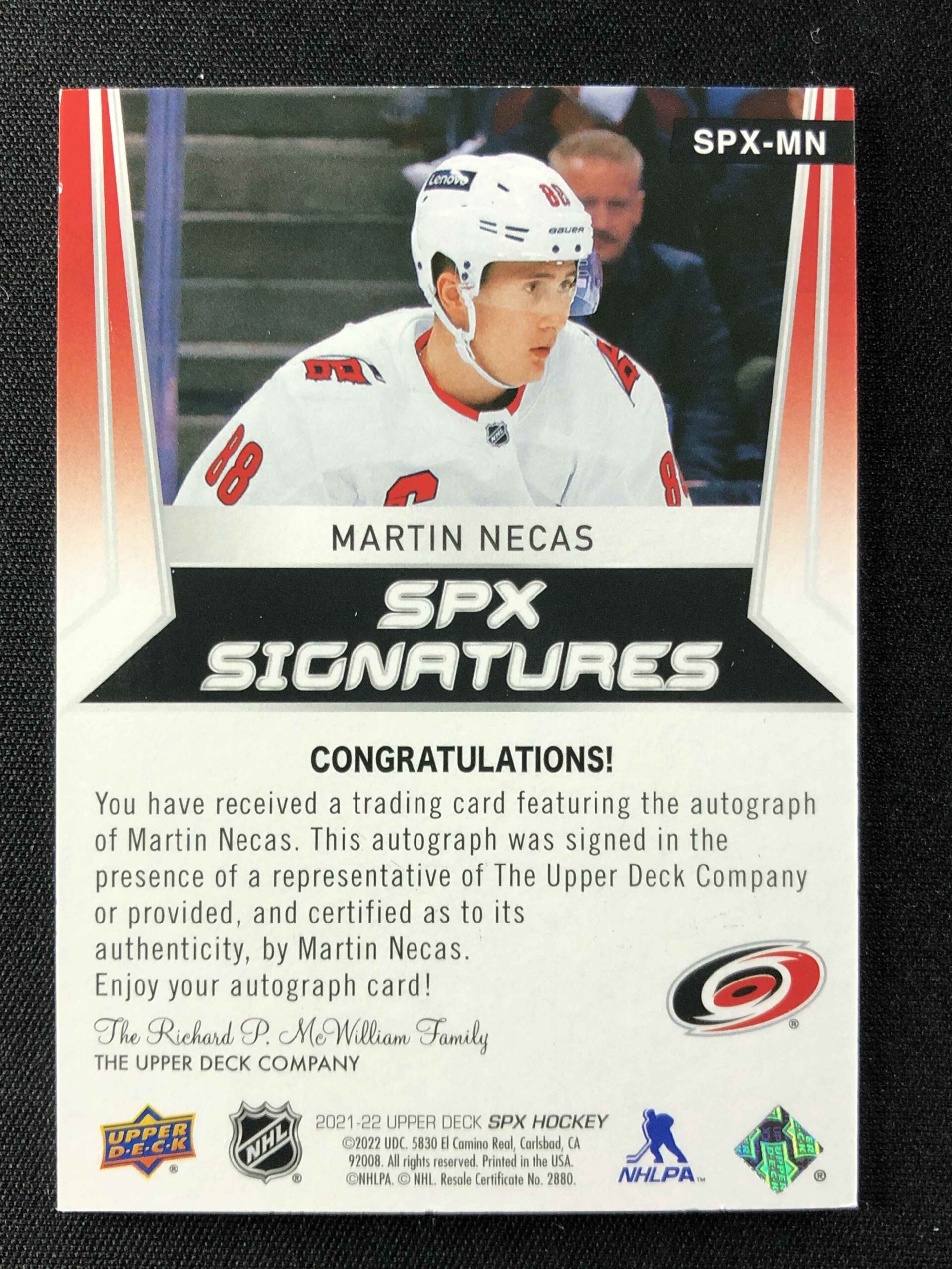 Sběratelská karta 2021/2022 Upper Deck SPx Signatures SPX-MN Martin Necas AUTO