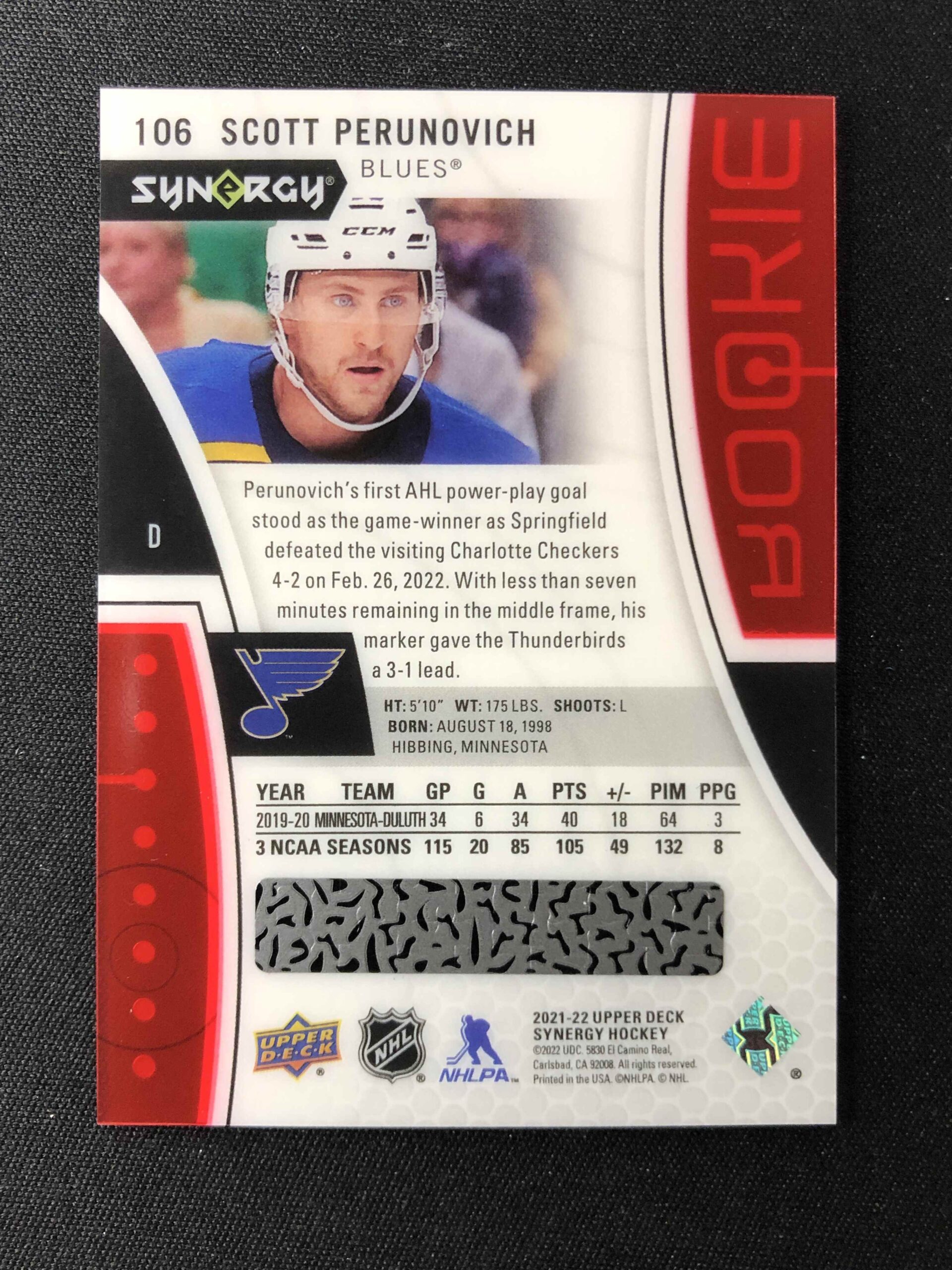 Sběratelská karta 2021/2022 Upper Deck Synergy Rookie Red Bounty 106 Scott Perunovich Paralel