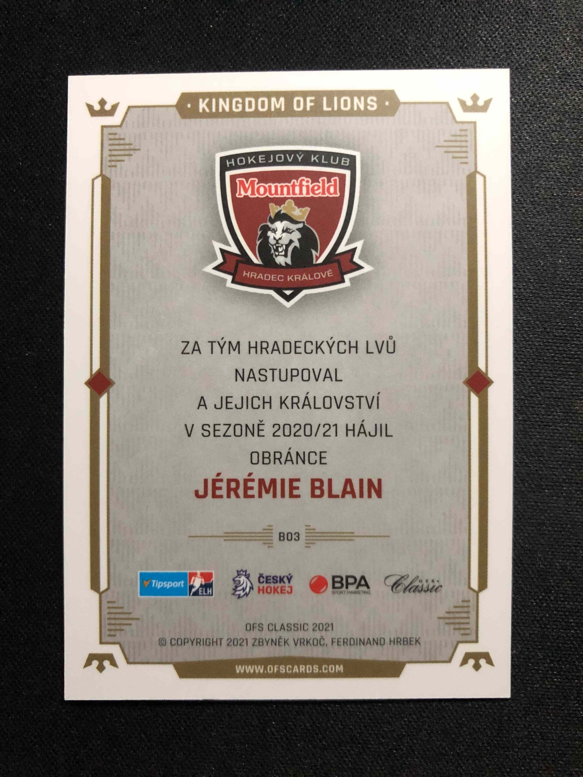 Sběratelská karta 2021 OFS Classic Kingdom of Lions B03 Jérémie Blain