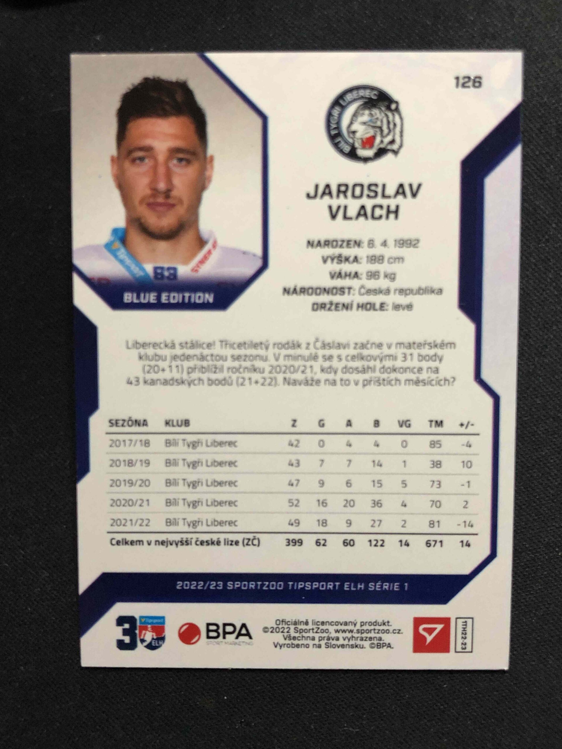 Sběratelská karta 2022/2023 Sportzoo Serie 1 Blue 126 Jaroslav Vlach Paralel 40/99
