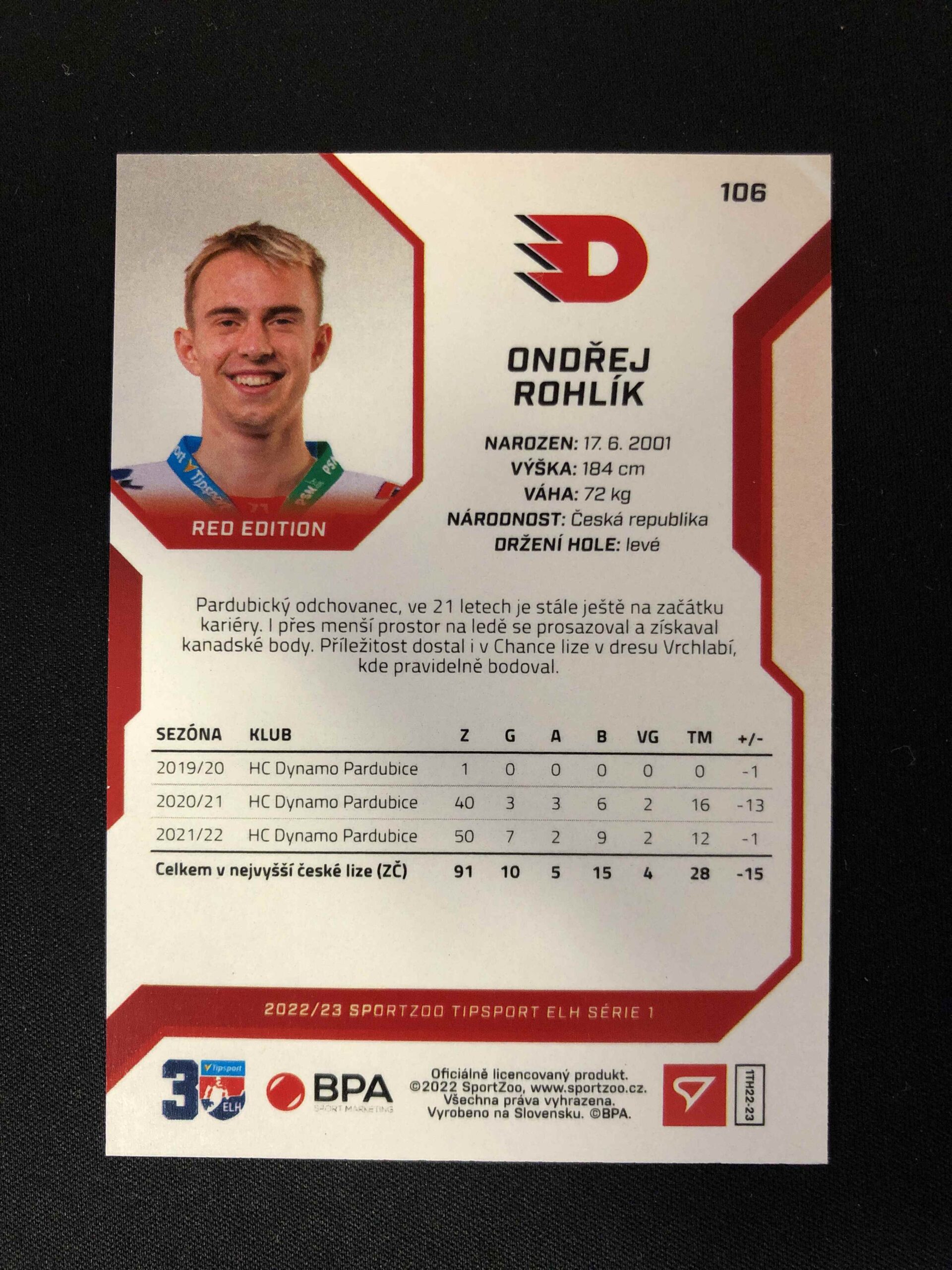 Sběratelská karta 2022/2023 Sportzoo Serie 1 Red 106 Ondřej Rohlík Paralel 11/49