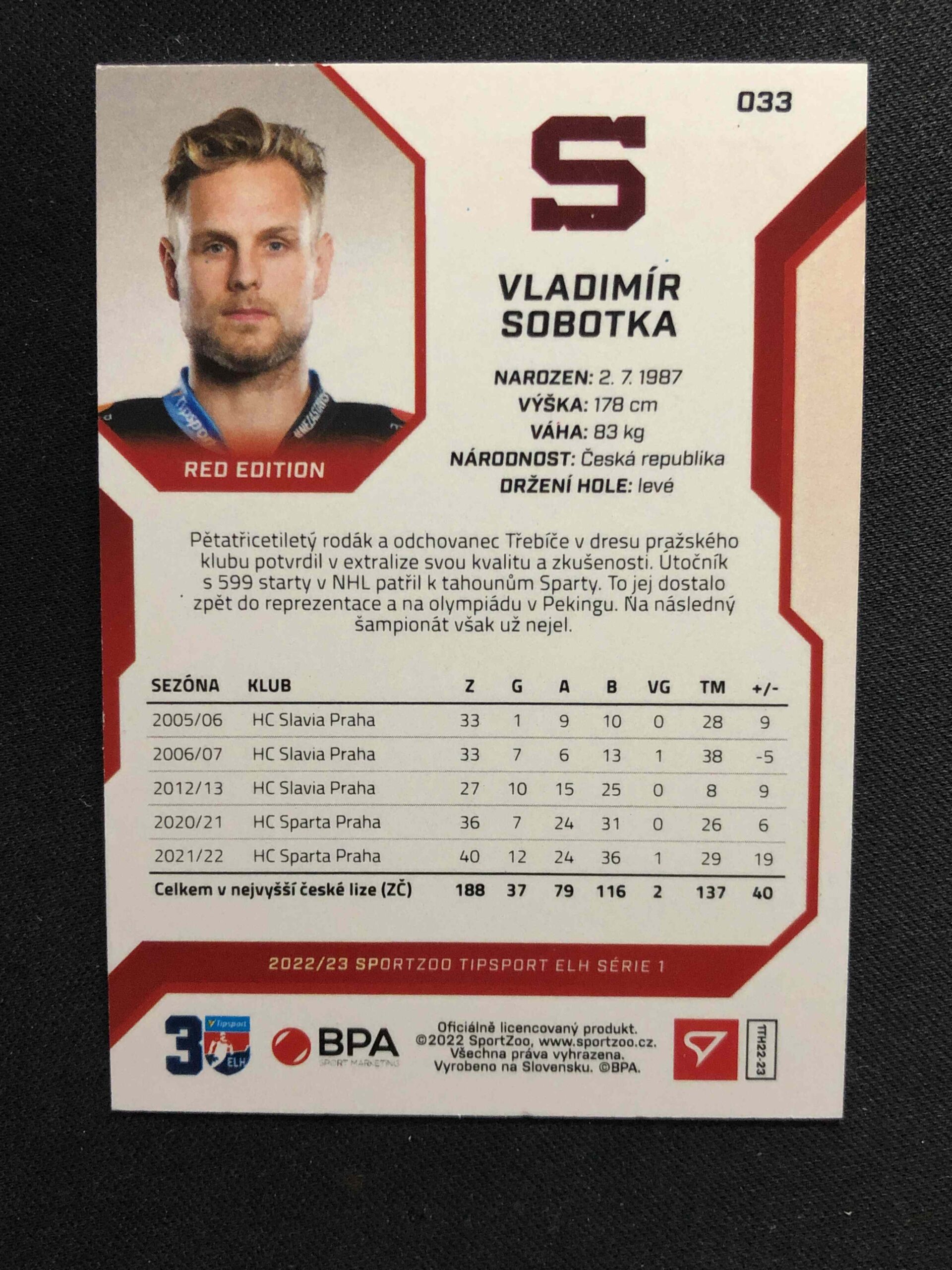 Sběratelská karta 2022/2023 Sportzoo Serie 1 Red 33 Vladimír Sobotka Paralel 32/49