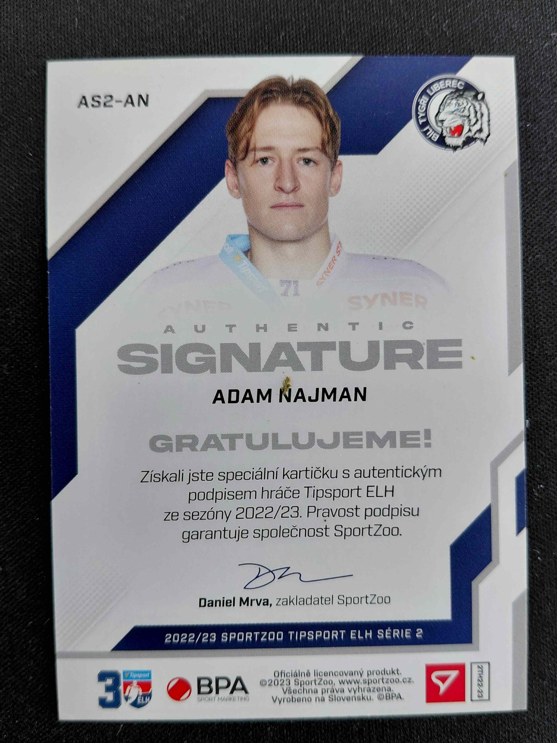 Sběratelská karta 2022/2023 Sportzoo Serie 2 Authentic Signature Level 2 AS2-AN Adam Najman AUTO 055/100