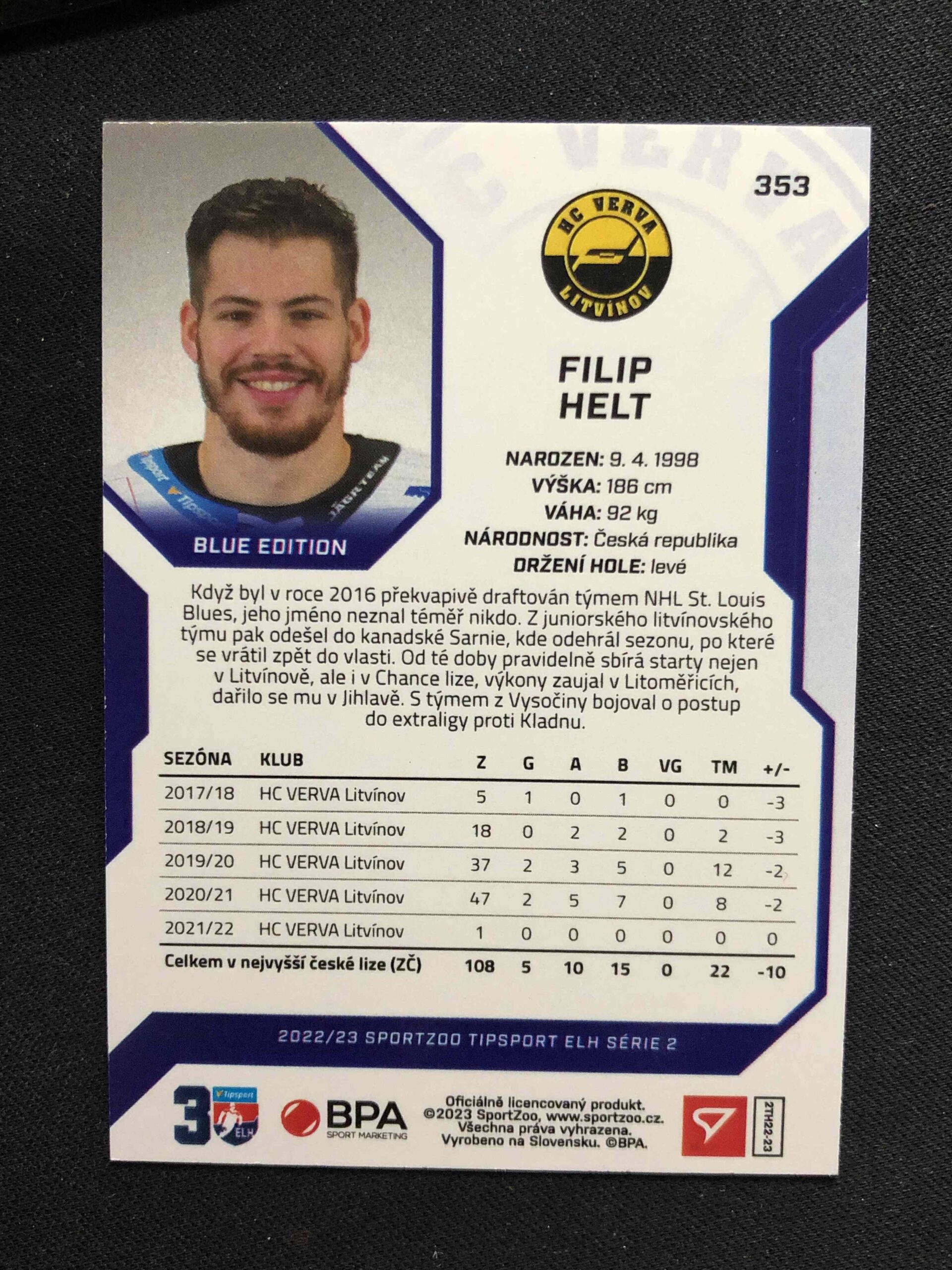 Sběratelská karta 2022/2023 Sportzoo Serie 2 Blue 353 Filip Helt Paralel 14/99