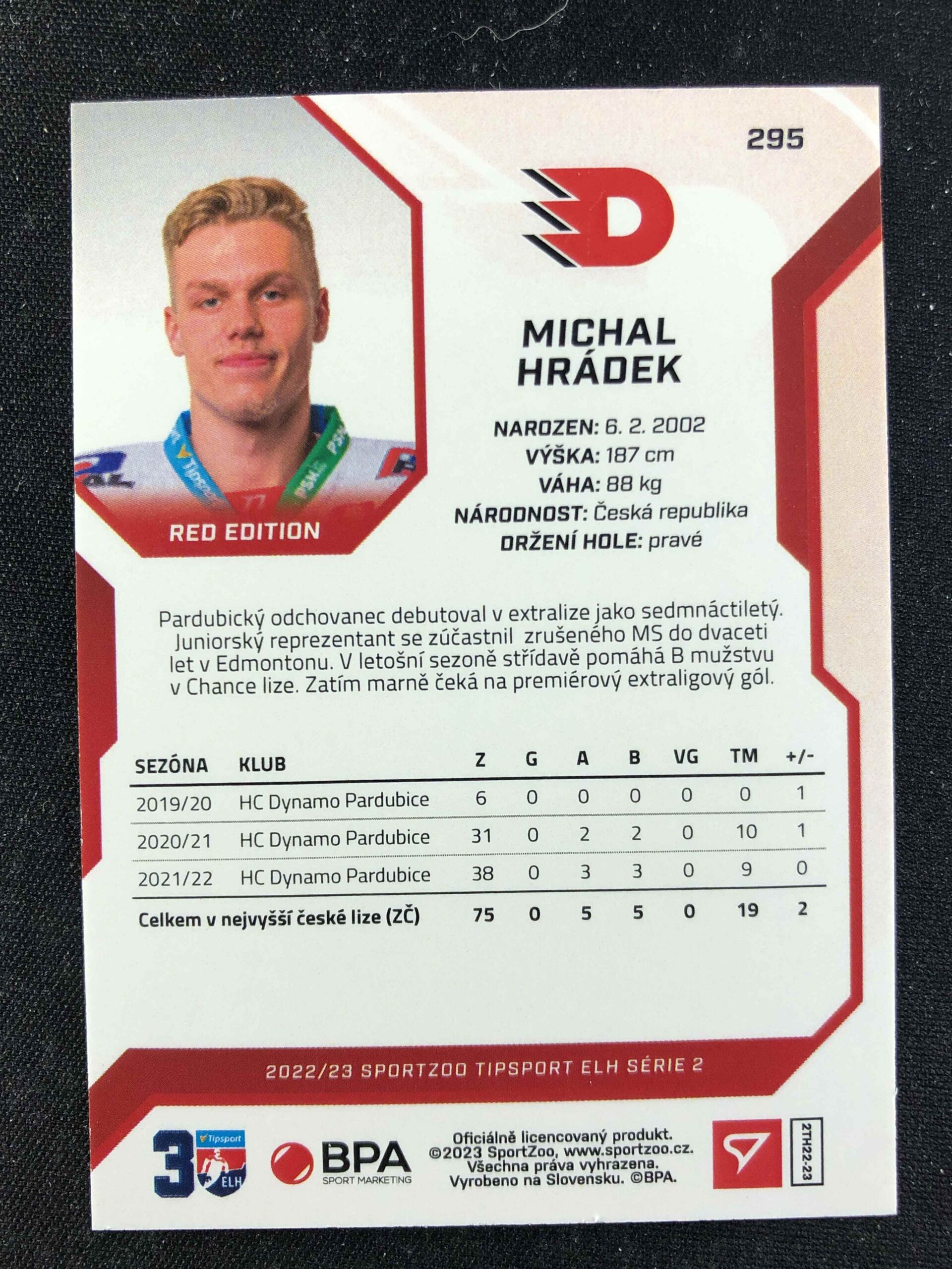 Sběratelská karta 2022/2023 Sportzoo Serie 2 Red 295 Michal Hrádek Paralel 33/49