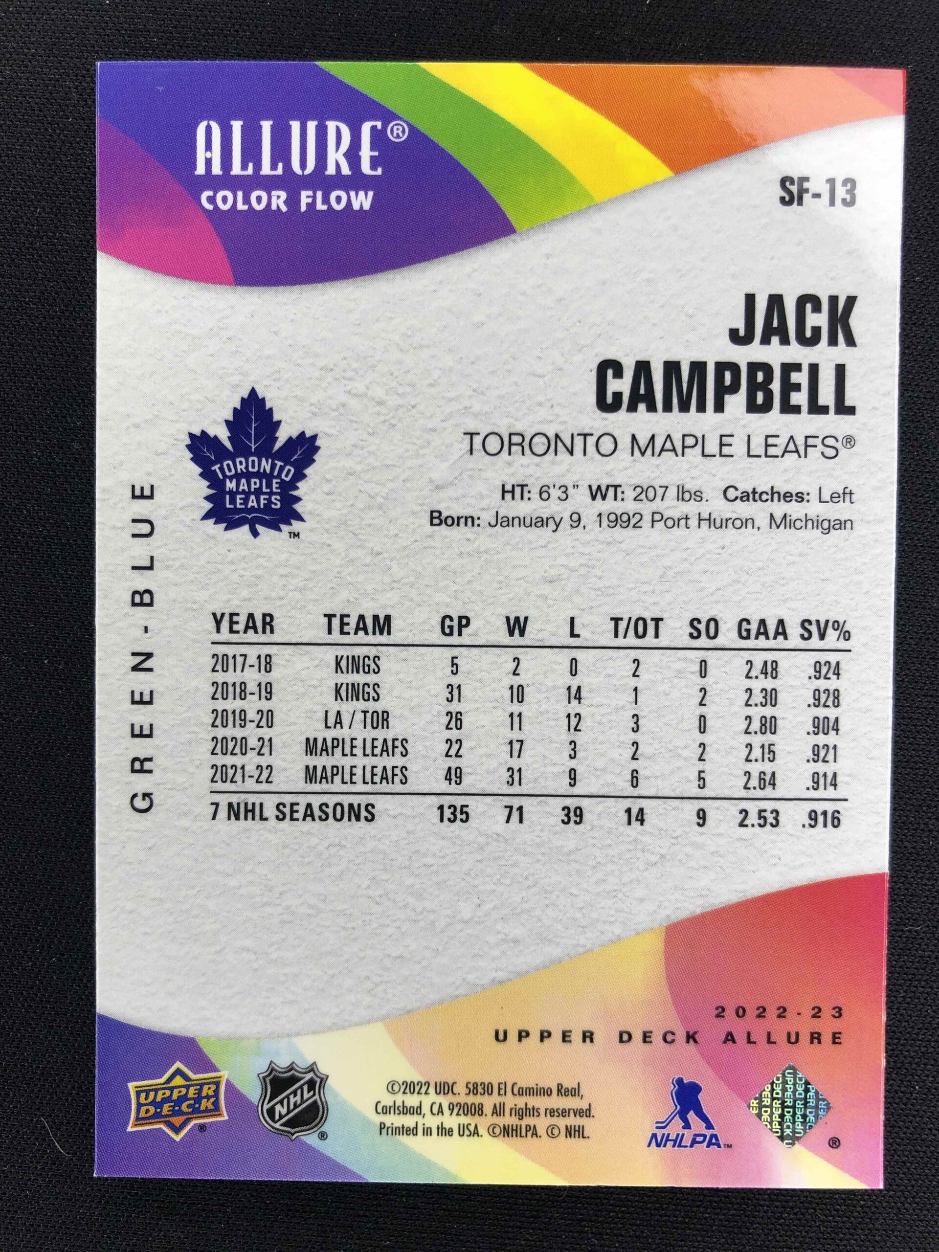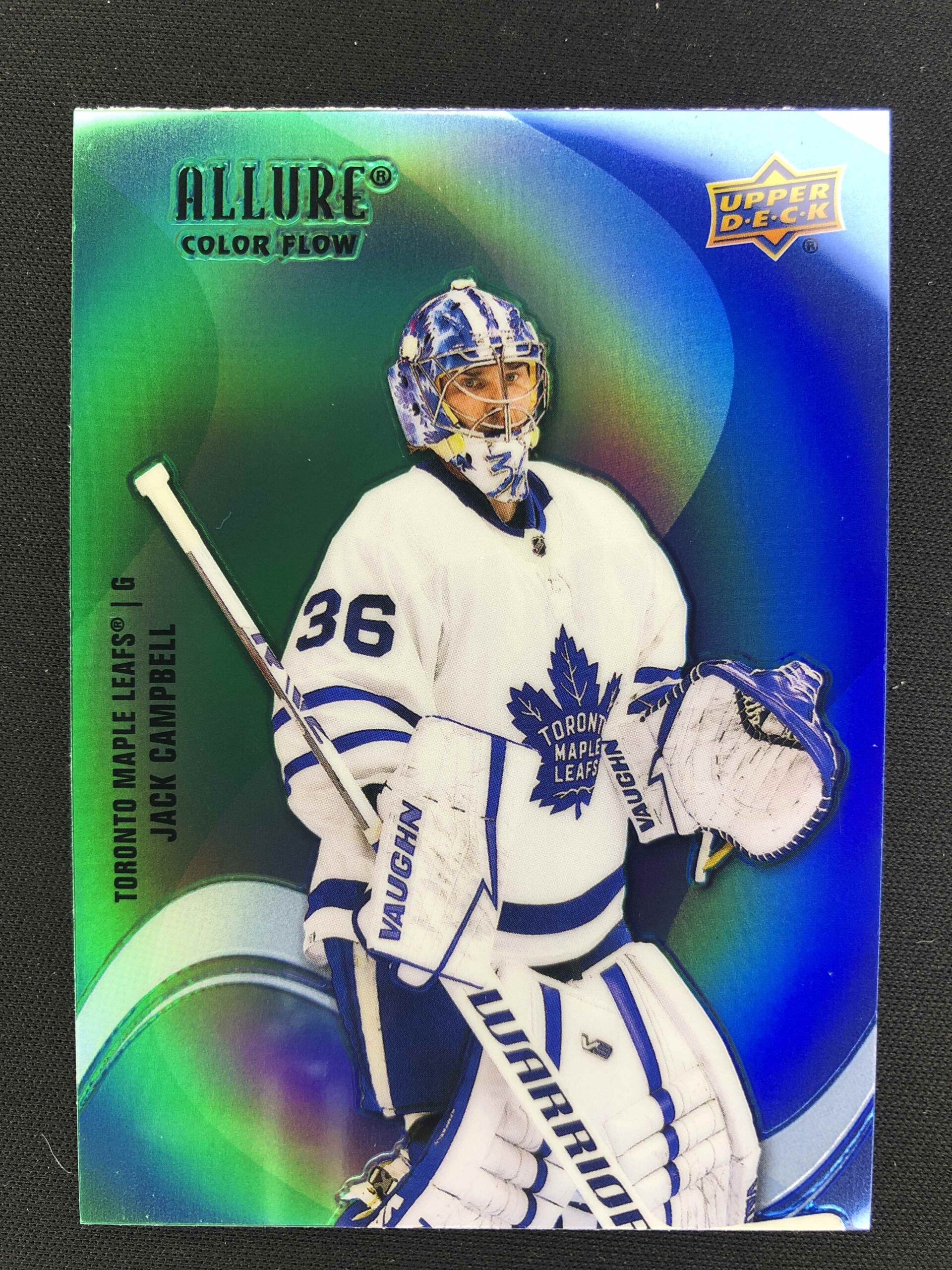 Sběratelská karta 2022/2023 Upper Deck Allure Color Flow – Green Blue SF-13 Jack Campbell Paralel