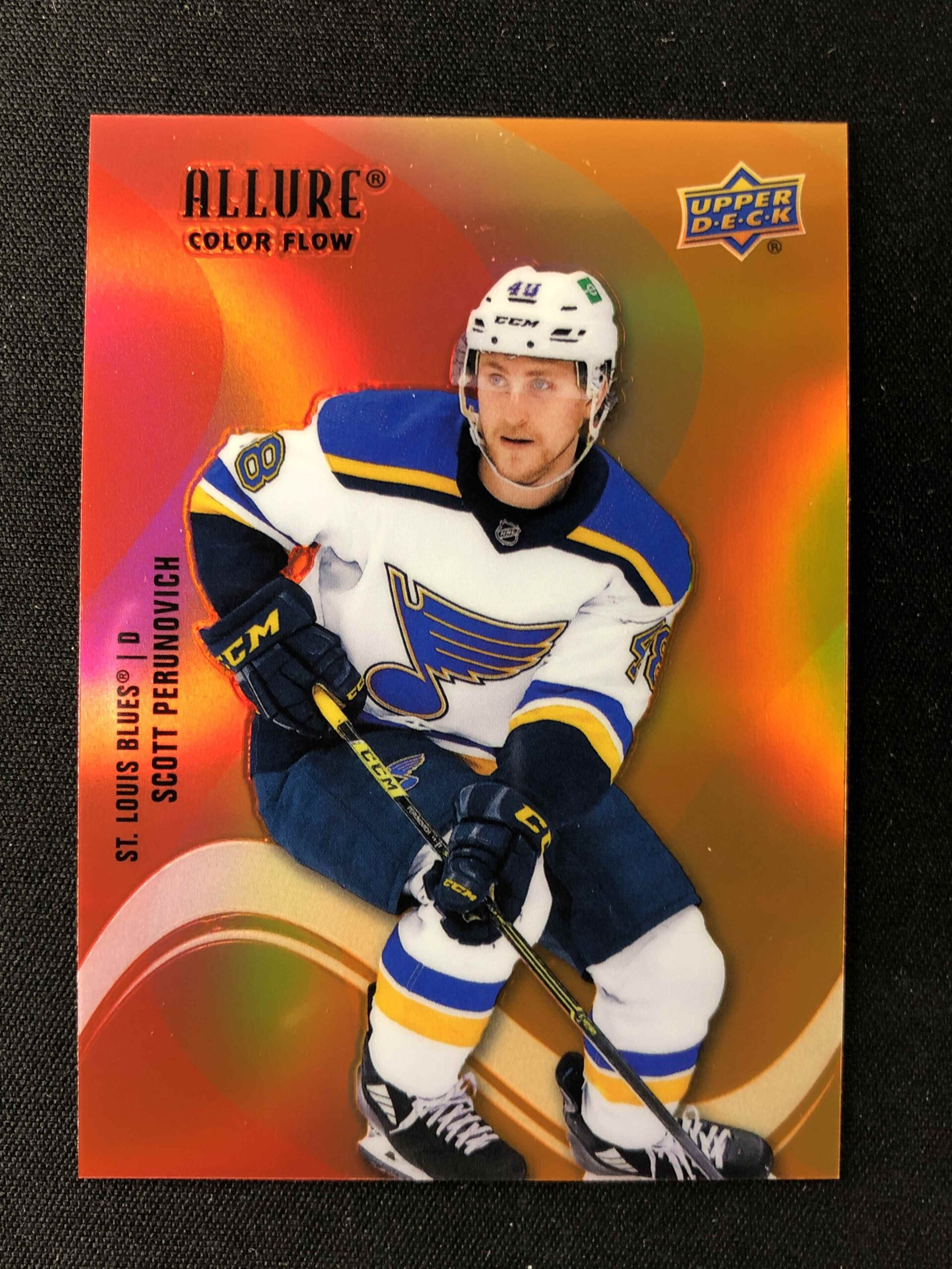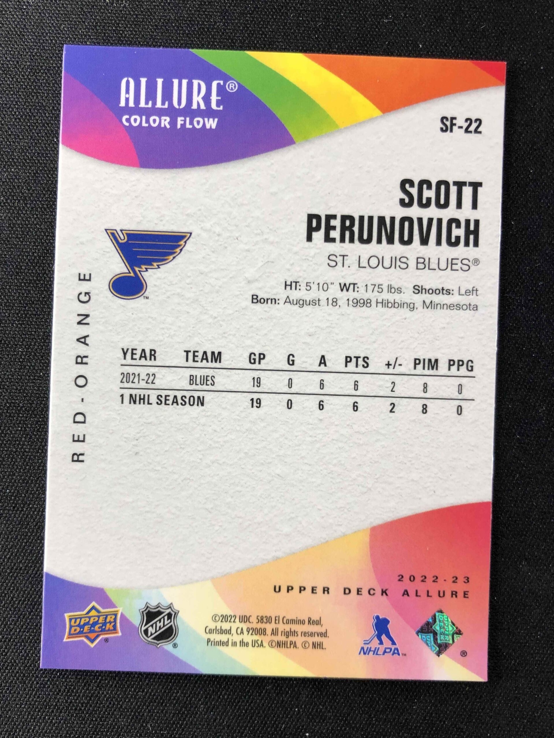 Sběratelská karta 2022/2023 Upper Deck Allure Color Flow – Red Orange SF-22 Scott Perunovich Paralel