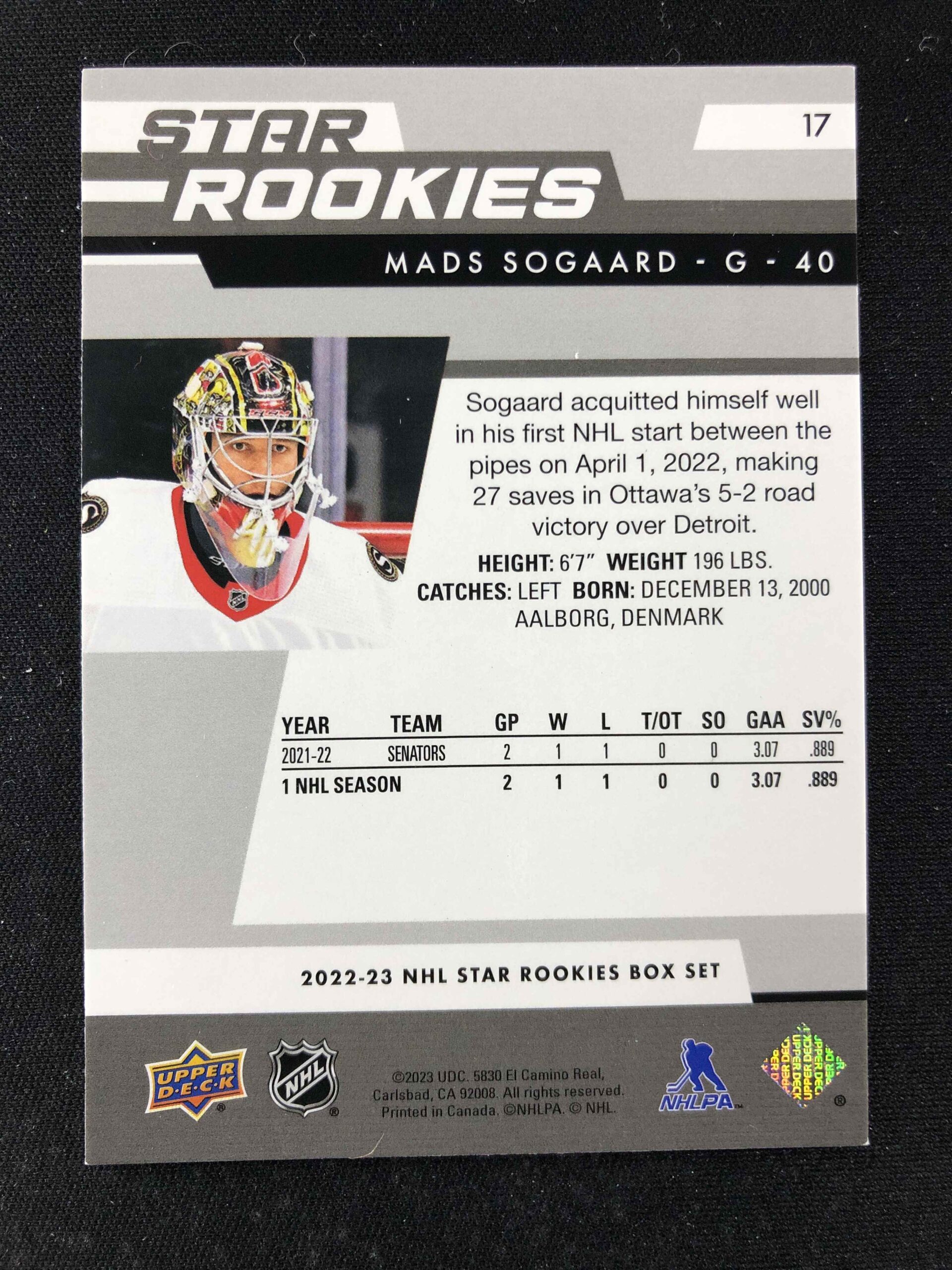2022/2023 Upper Deck NHL Star Rookies Box Set Base 17 Mads Sogaard
