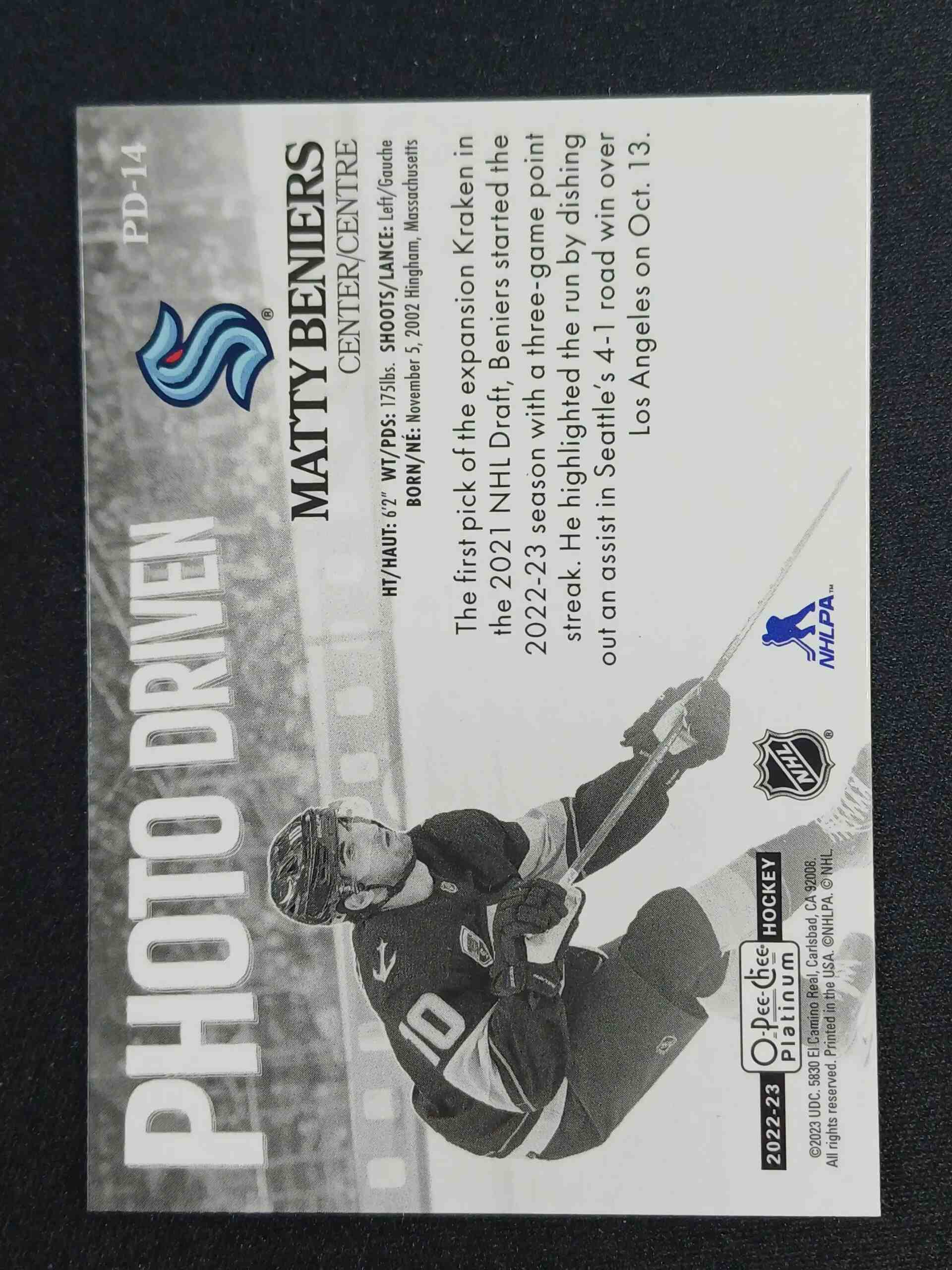Sběratelská karta 2022/2023 Upper Deck OPC Platinum Photo Driven PD-14 Matty Beniers Inzert