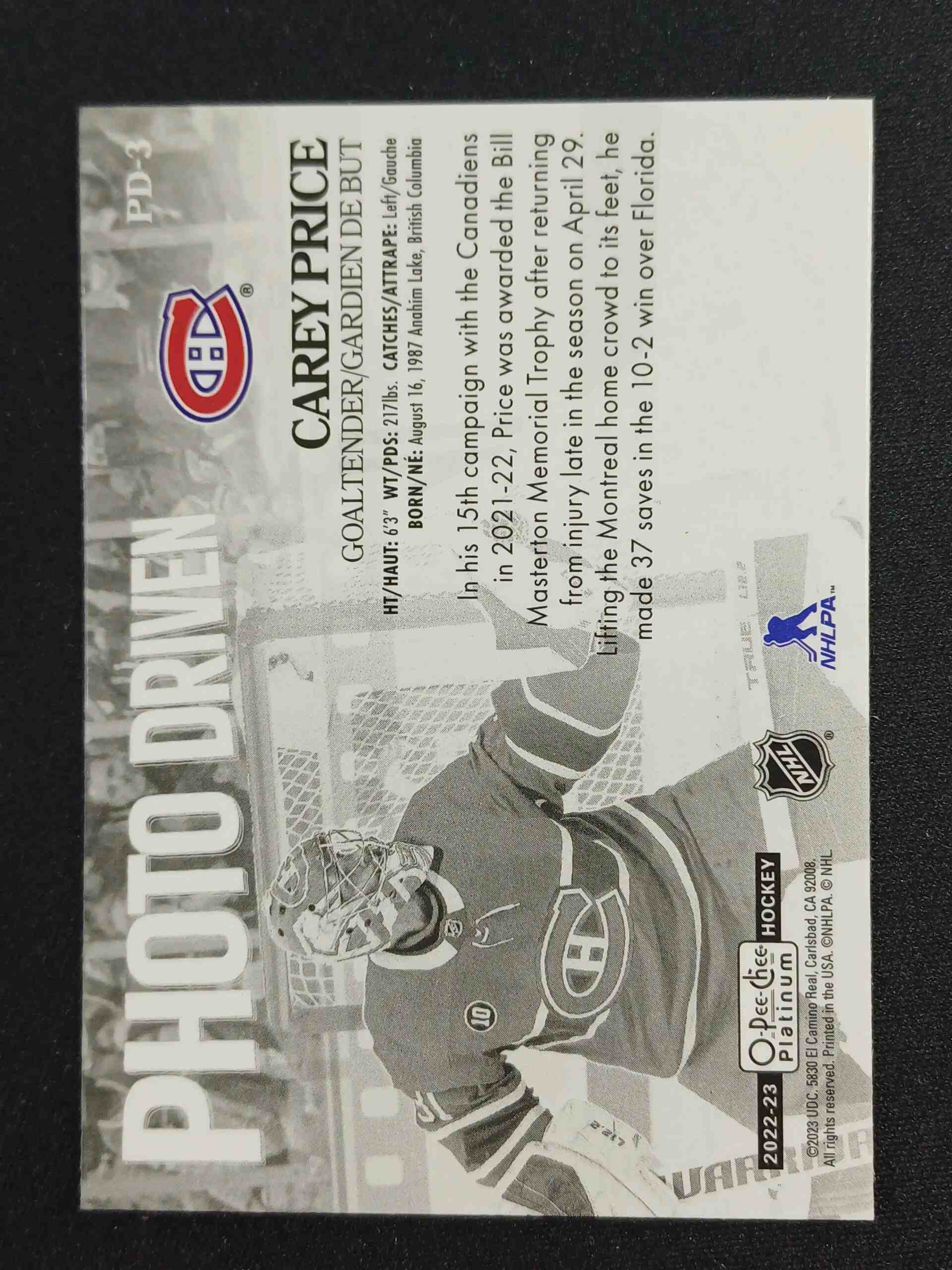 2022/2023 Upper Deck OPC Platinum Photo Driven PD-3 Carey Price Inzert