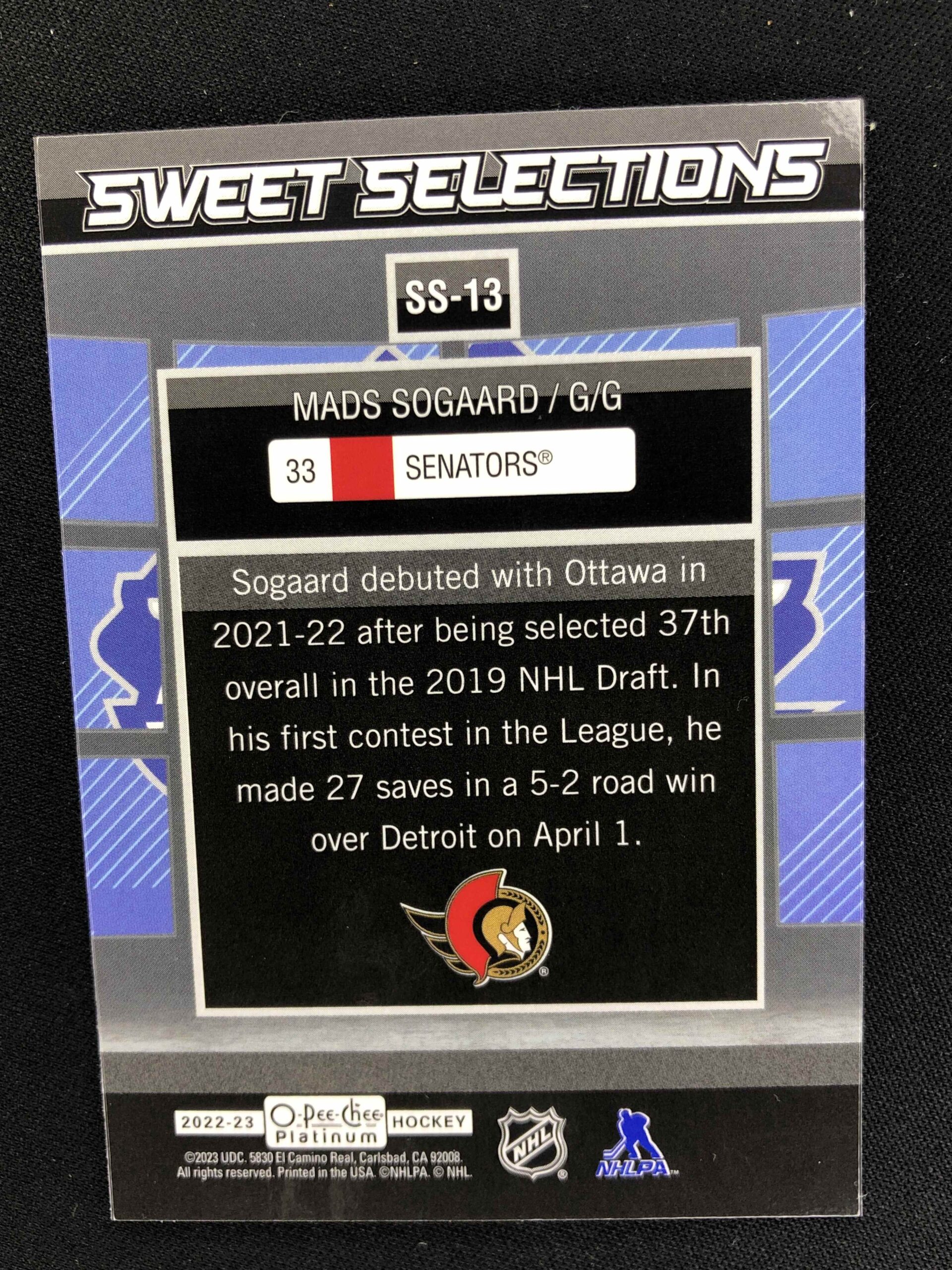 Sběratelská karta 2022/2023 Upper Deck OPC Platinum Sweet Selections SS-13 Mads Sogaard Inzert
