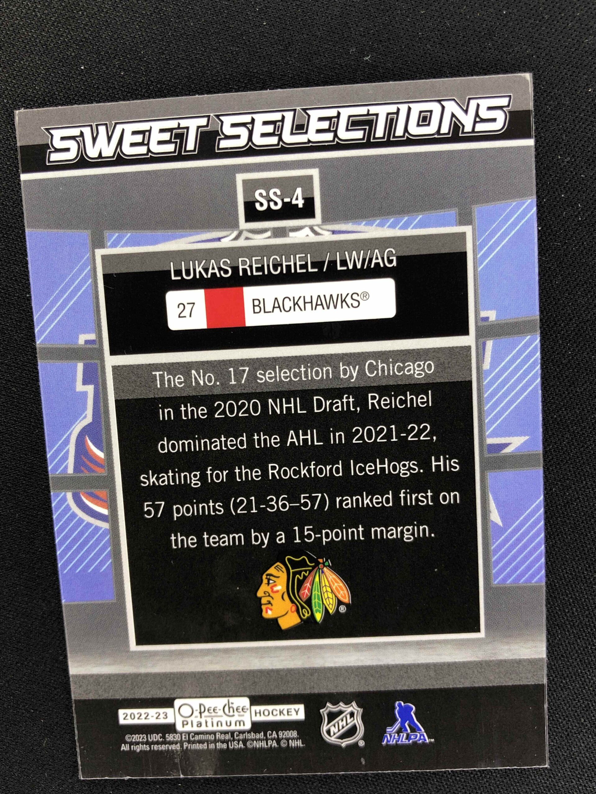 Sběratelská karta 2022/2023 Upper Deck OPC Platinum Sweet Selections SS-4 Lukas Reichel Inzert