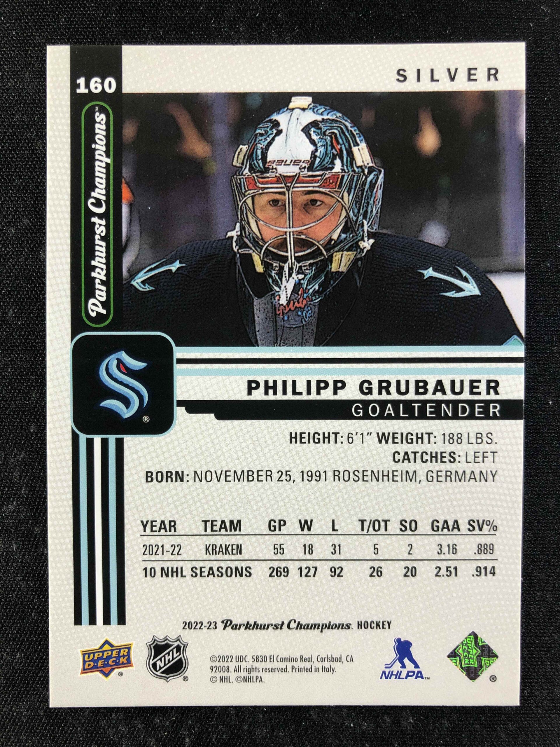 Sběratelská karta 2022/2023 Upper Deck Parkhurst Champions Silver 160 Philipp Grubauer Paralel